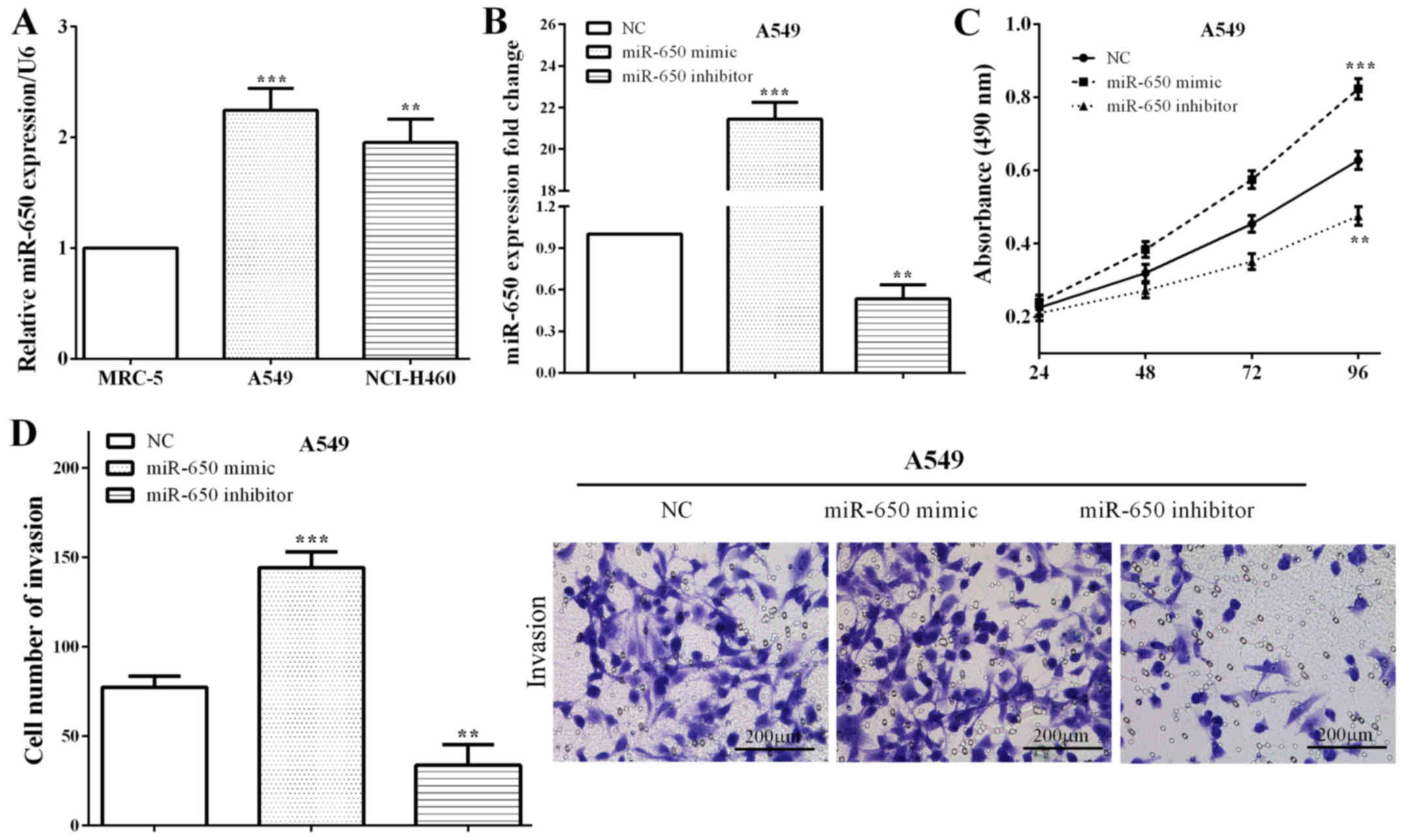 Expression of miR-650 was calculated in NSCLC cell lines (A549 and NCI-H460) and a bronchial epithelial cell line (MRC-5). Similar to results in tissues, miR-650 was overexpressed in NSCLC A549 cells (P=0.0004) and NCI-H460 (P=0.0014) versus that in normal MRC-5 cells (Fig. 2A), which suggested that miR-650 may play important roles in growth and metastasis of NSCLC. The miR-650 mimic or miR-650 inhibitor as well as the negative control (NC) was transfected with A549 cells. We measured the expression of miR-650 by RT-qPCR, and it demonstrated that miR-650 was upregulated in A549 cells transfected miR-650 mimic (P<0.0001), while downregulated after transfected with miR-650 inhibitor (P=0.0013) (Fig. 2B). Subsequently, CCK8 and Transwell assays were performed to calculate the proliferative and invasive abilities of miR-650. As expected, the cell proliferation (P=0.0008) and invasion (P=0.0004) were enhanced by miR-650 mimic, whereas, miR-650 reduced the proliferative (P=0.0019) and invasive (P=0.0044) capacities in A549 cells (Fig. 2C and D), which illustrated that miR-650 acted as an oncogene in NSCLC.