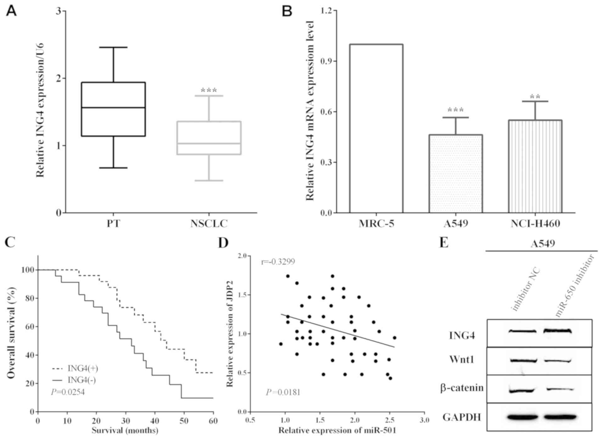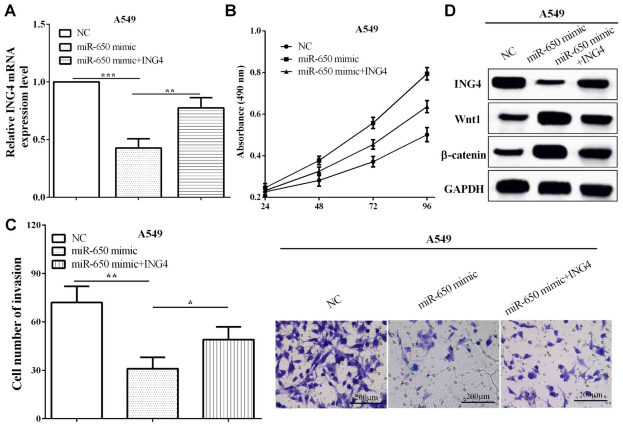In brief, miR-650 was upregulated in NSCLC and upregulation of miR-650 indicated a shorter overall survival of NSCLC, while ING4 demonstrated the opposite results. miR-650 promoted cell proliferation and invasion through Wnt-1/β-catenin pathway by binding to ING4. ING4 was able to partially reverse the function of miR-650 in cell proliferation and invasion.