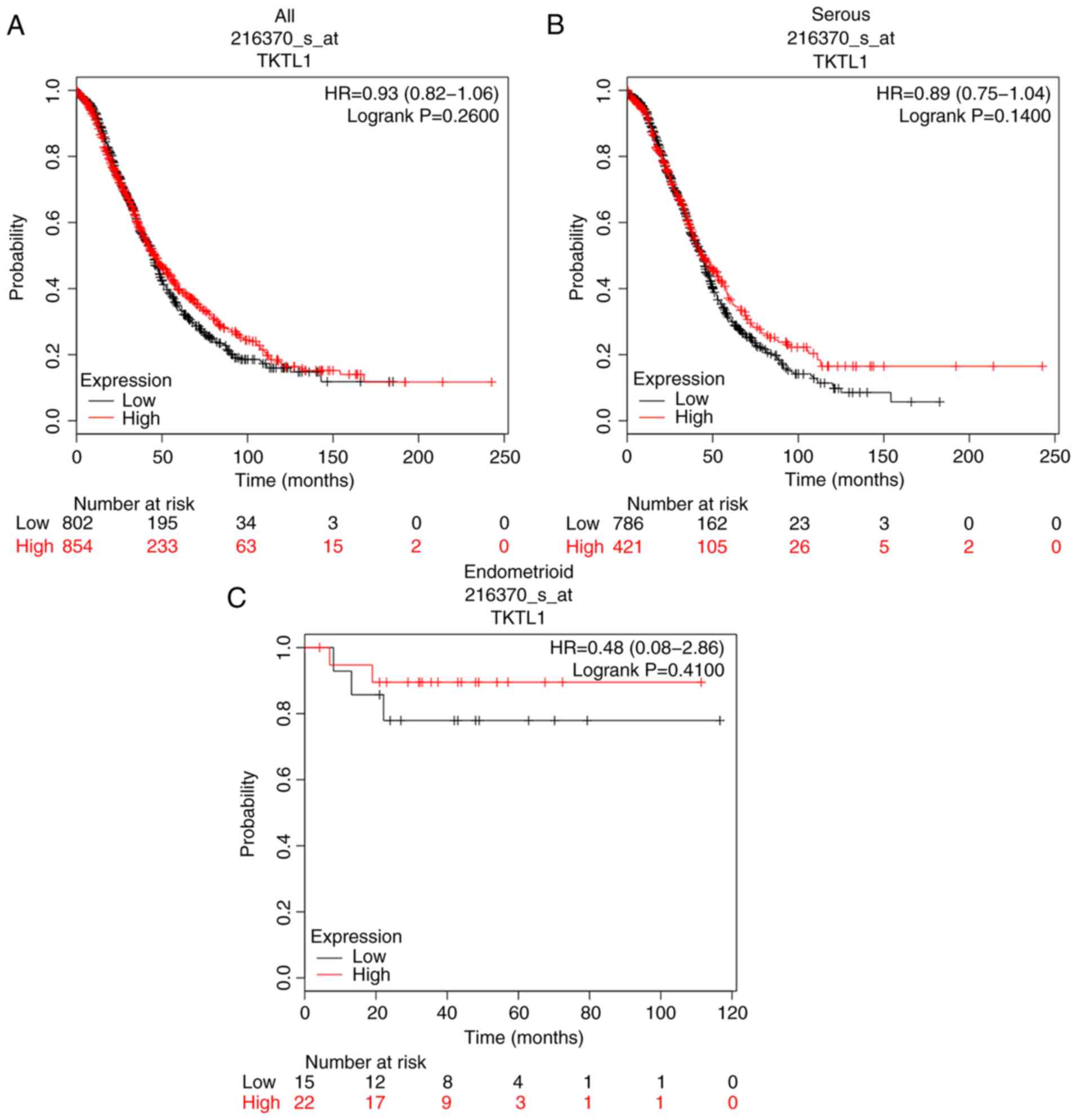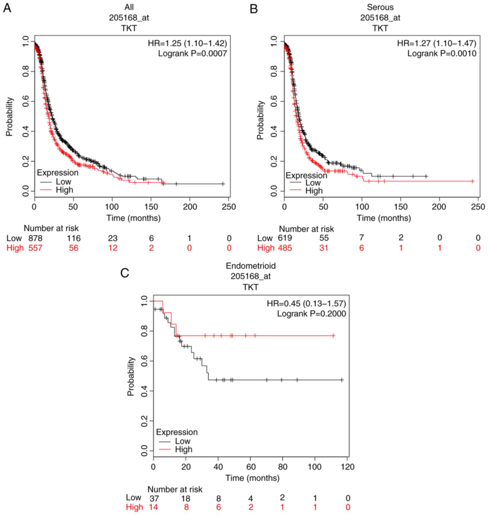 The prognostic value of transketolase family genes was assessed. Survival information for the three transketolase genes was obtained from the Kaplan-Meier plotter. The prognostic value of TKT mRNA expression in ovarian cancer was evaluated; the Affymetrix identifier (ID) was 205168_at TKT. PFS curves were plotted for all patients with ovarian cancer (N=1,435; Fig. 2A), patients with serous cancer (N=1,104; Fig. 2B) and endometrioid cancer (N=51; Fig. 2C). Increased expression levels of TKT mRNA were identified to be associated with poorer PFS in all patients with ovarian cancer (HR, 1.25; 95% CI, 1.10–1.42; P=0.0007). High TKT expression was also associated with poor PFS in serous ovarian cancer (HR, 1.27; 95% CI, 1.10–1.47; P=0.0010). However, TKT mRNA expression levels were not associated with PFS in patients with endometrioid cancer. The OS between the high and low-TKT expression groups in all ovarian cancer and serous ovarian cancer cases was not significantly different (Fig. 3A and B). TKT mRNA expression was not associated with OS in patients with endometrioid cancer (Fig. 3C).