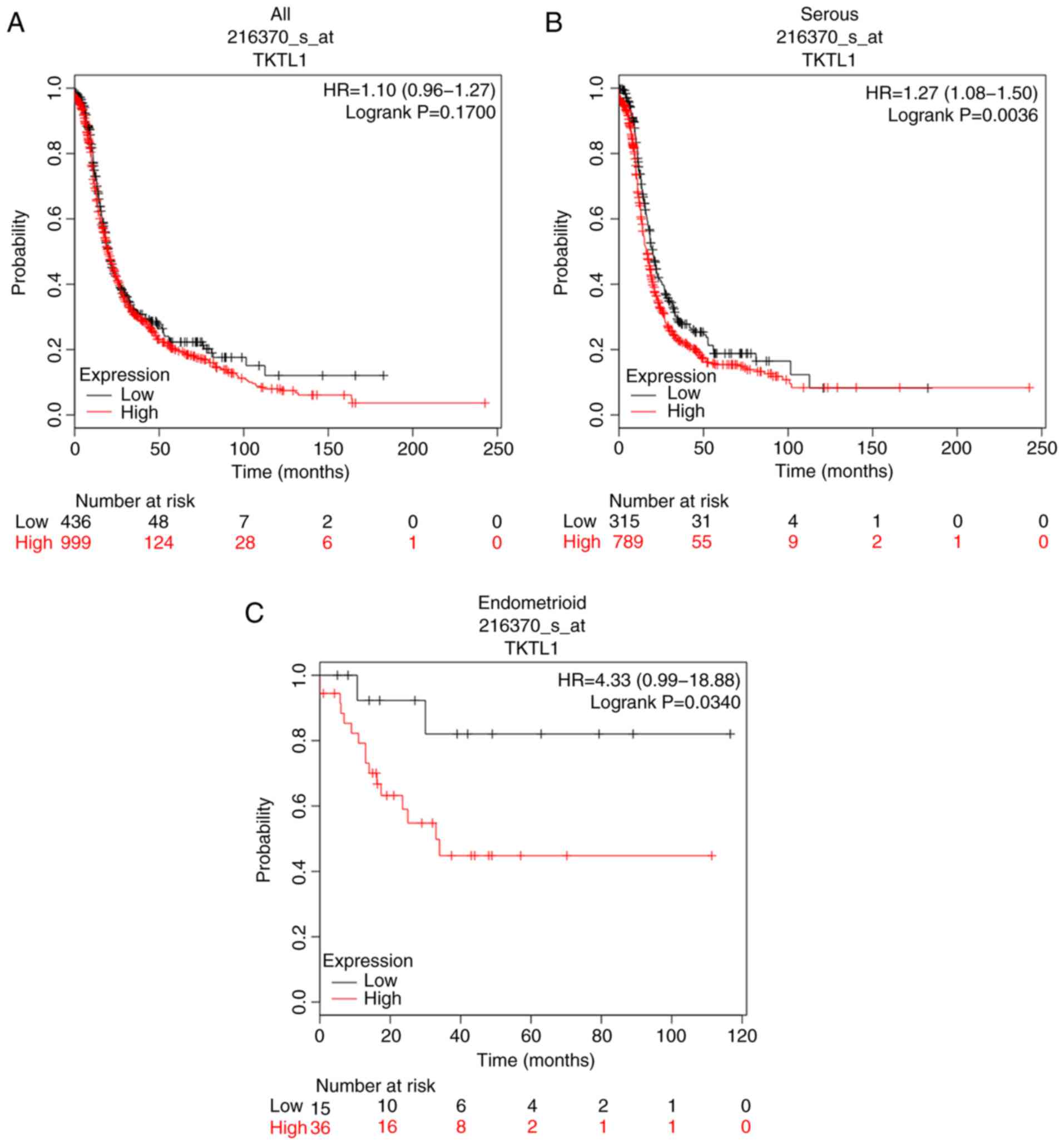 The prognostic value of TKTL1 mRNA expression in ovarian cancer was evaluated; the Affymetrix ID was 216370_s_at TKTL1. No differences were observed in PFS between the high and low-TKTL1 expression groups in all patients with ovarian cancer (Fig. 4A). However, stratified analyses demonstrated that high expression of TKTL1 was associated with poor PFS in patients with serous ovarian cancer (HR, 1.27; 95% CI, 1.08–1.50; P=0.0036; Fig. 4B), as well as in patients with endometrioid ovarian cancer (HR, 4.33; 95% CI, 0.99–18.88; P=0.0340; Fig. 4C). TKTL1 mRNA expression levels were not associated with OS in all patients with ovarian cancer (Fig. 5A), nor in patients with serous ovarian cancer (Fig. 5B) or endometrioid ovarian cancer (Fig. 5C).