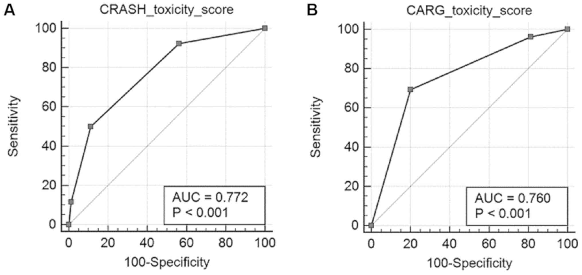 Zhang J, Liao X, Feng J, Yin T and Liang Y: Prospective comparison of the value of CRASH and CARG toxicity scores in predicting chemotherapy toxicity in geriatric oncology. Oncol Lett 18: 4947-4955, 2019.