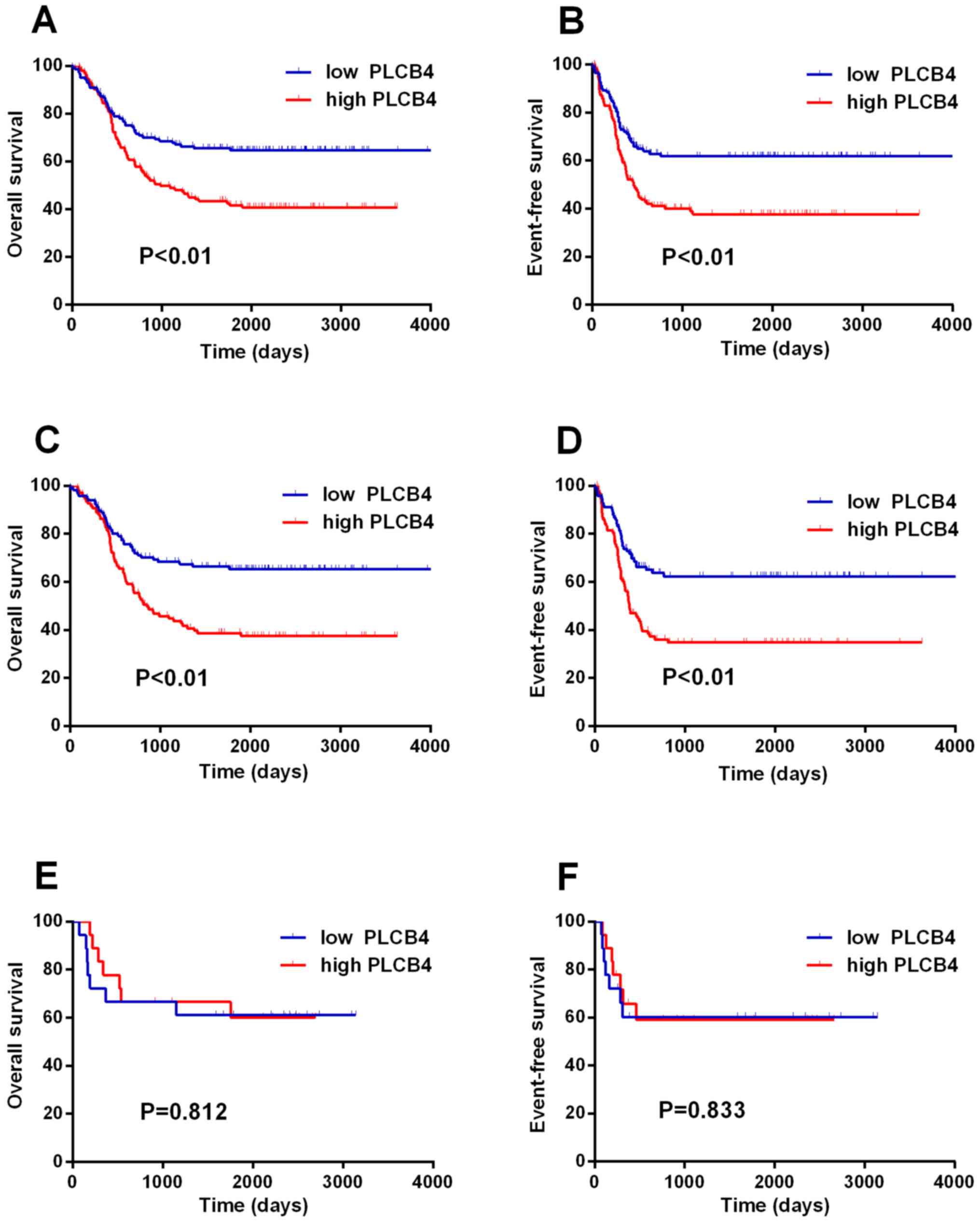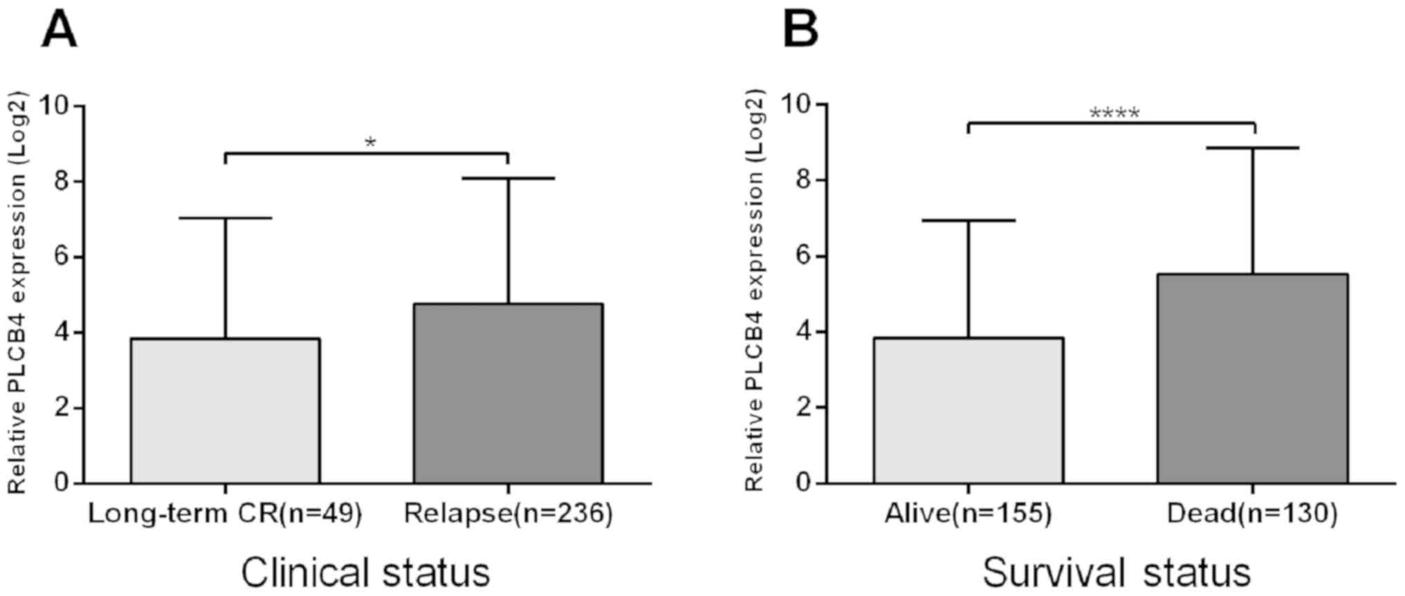In conclusion, upregulation of PLCB4 was associated with a poor clinical outcome in patients with AML. PLCB4 may therefore be a potential prognostic biomarker and therapeutic target of AML.