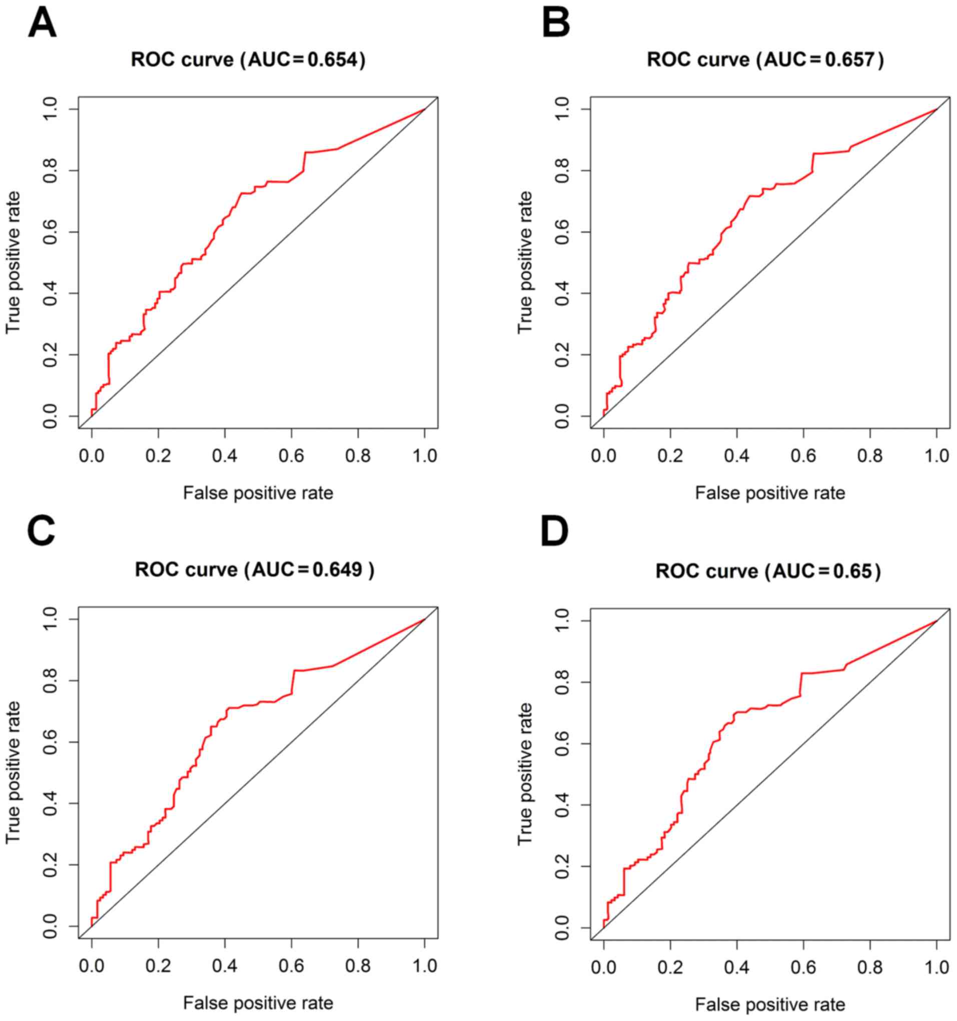 In order to evaluate the clinical utility of PLCB4 expression as a prognostic biomarker of AML, the AUC of ROC curves were used to determine the discriminative capacity of PLCB4 expression to predict 5-year survival rates. The AUC values were high for the 5-year ROC curves of OS and EFS (AUC, 0.654 and 0.657, respectively; Fig. 3A and B), and similar results were observed for OS and EFS times of patients treated with chemotherapy in CR1 (AUC, 0.649 and 0.65, respectively; Fig. 3C and D). Overall, these findings suggest that PLCB4 expression may serve as a potential prognostic biomarker of AML.