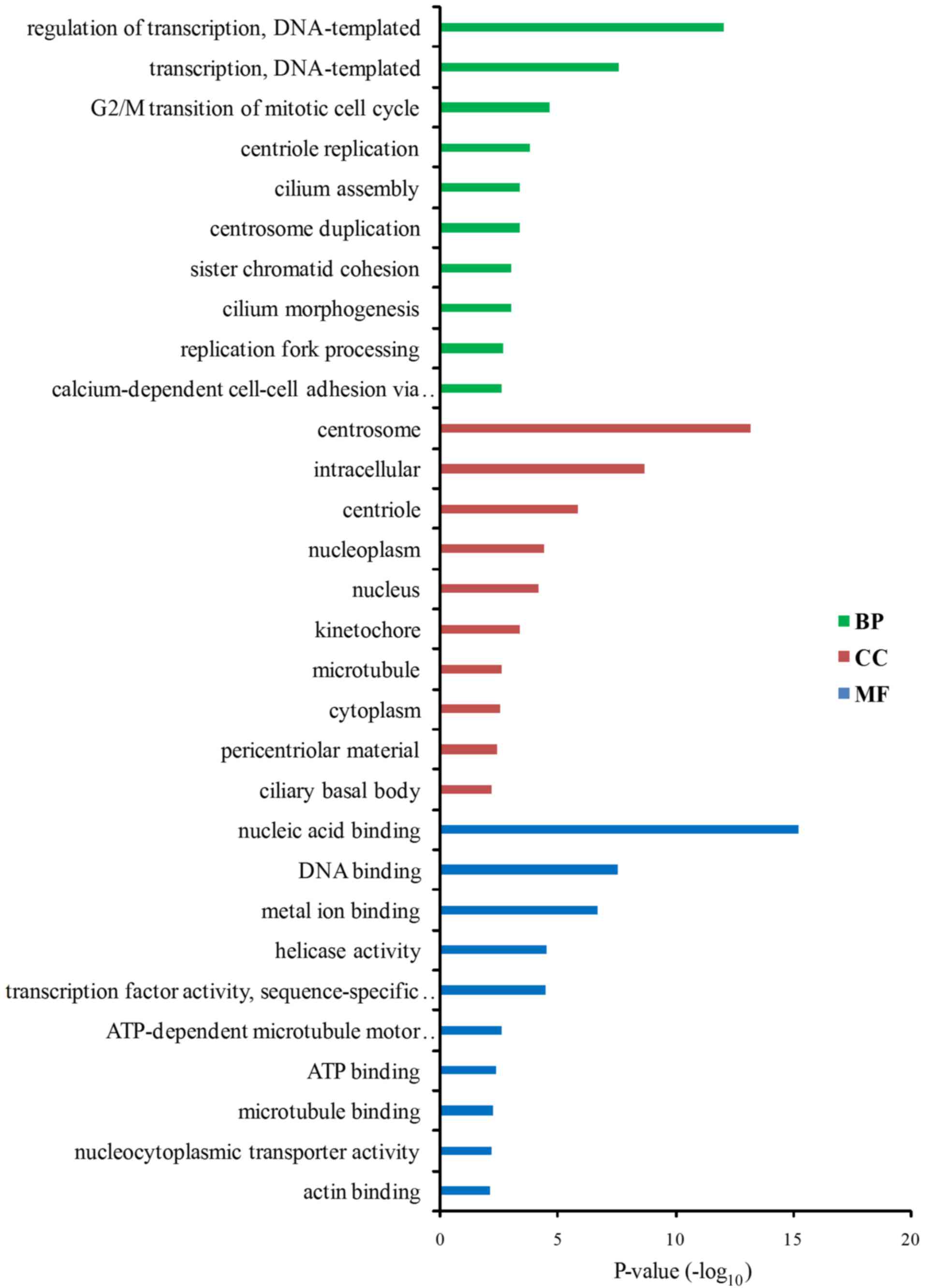In order to obtain insights into the biological functions and potential mechanisms of PLCB4 in AML, PLCB4-associated genes were identified using Spearman's rank correlation analysis. A total of 648 mRNAs were significantly correlated with PLCB4 expression. Of these, 14 genes were negatively correlated and 634 genes were positively correlated. PCYT1B, PARD6B, RAB3IP, CALD1 and ALDH1A1 were the top 5 genes that positively correlated with the expression levels of PLCB4 according to the value of the correlation coefficient. Subsequently, GO functional and KEGG pathway enrichment analysis were conducted, based on the genes that were correlated with PLCB4 expression. The correlated genes were significantly enriched in the pathways associated with ‘regulation of transcription’, ‘G2/M transition of mitotic cell cycle’, ‘centriole replication’, ‘cilium assembly’ and ‘calcium-dependent cell-cell adhesion via plasma membrane cell adhesion molecules’ (Fig. 4). KEGG pathway analysis predicted three potential pathways that were associated with PLCB4 and its correlated genes and were regulated during AML, including the thyroid hormone signaling pathway, RAP1 signaling and platelet activation (Table IV).