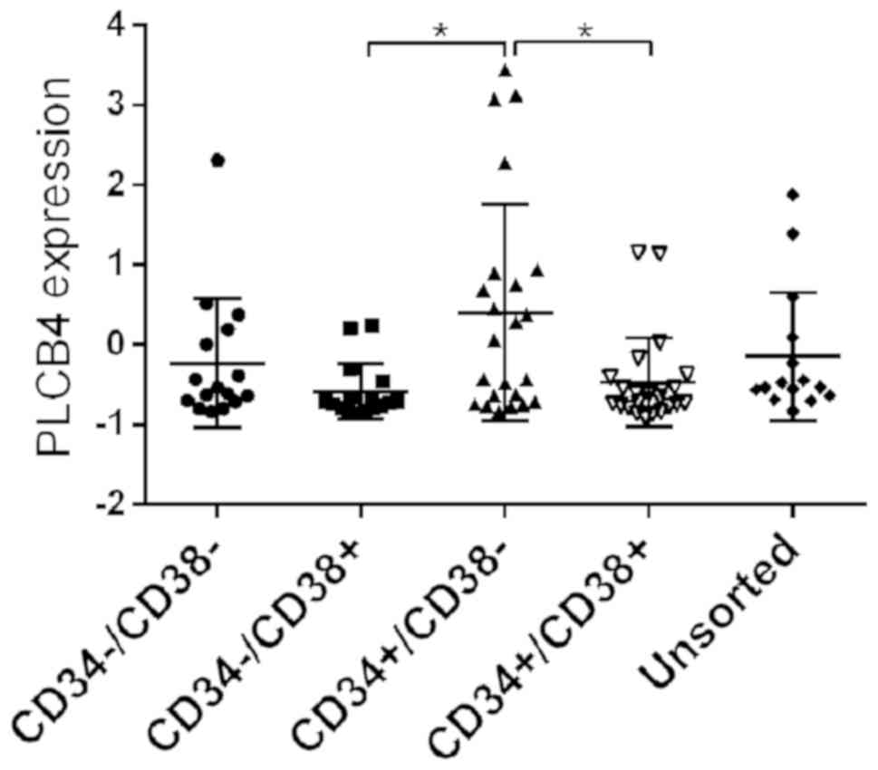 Amongst all cell populations that were assessed, the expression of PLCB4 was highest in CD34+CD38− cells compared with both CD34−/CD38+ and CD34+CD38− cells (P=0.020 and 0.029, respectively; Fig. 5).
