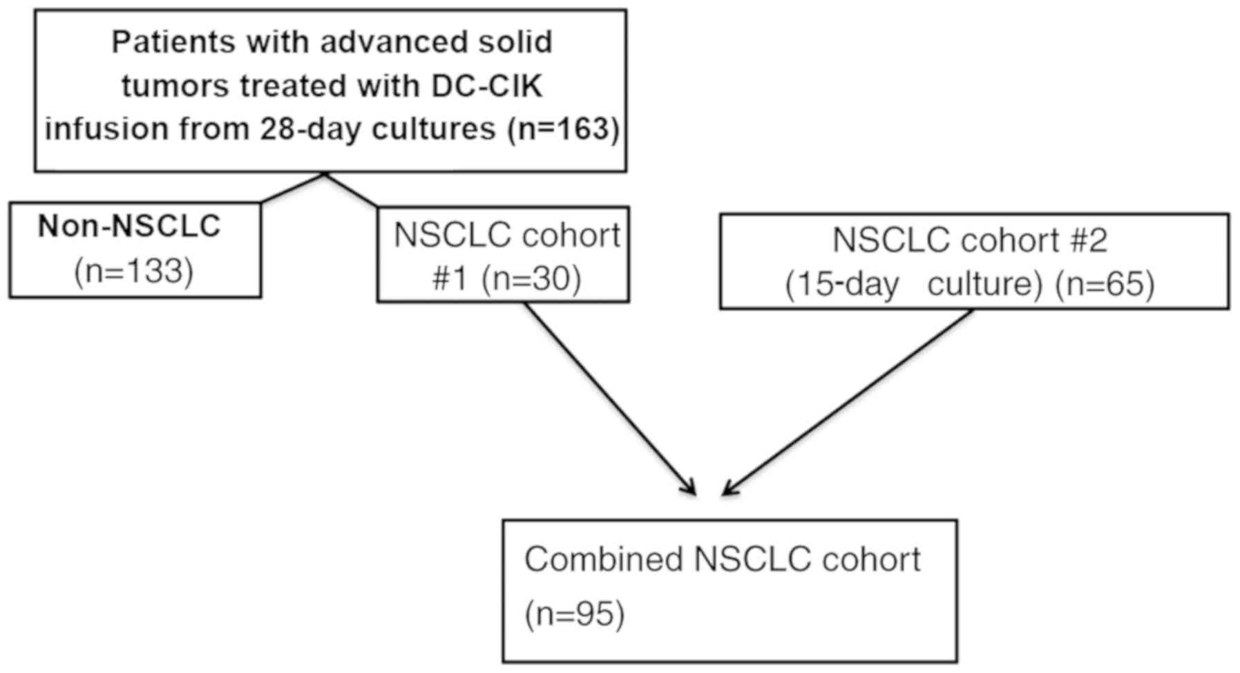 For data analysis, two study groups were created (Fig. 1). Firstly, 163 patients with advanced cancer (including 30 with NSCLC) were assessed to determine when the number of cultured CIKs peaked Among these 95 NSCLC patients, 45 received DC-CIK cell therapy alone and 50 received DC-CIKs combined with chemotherapy. Their characteristics are listed in Table I.