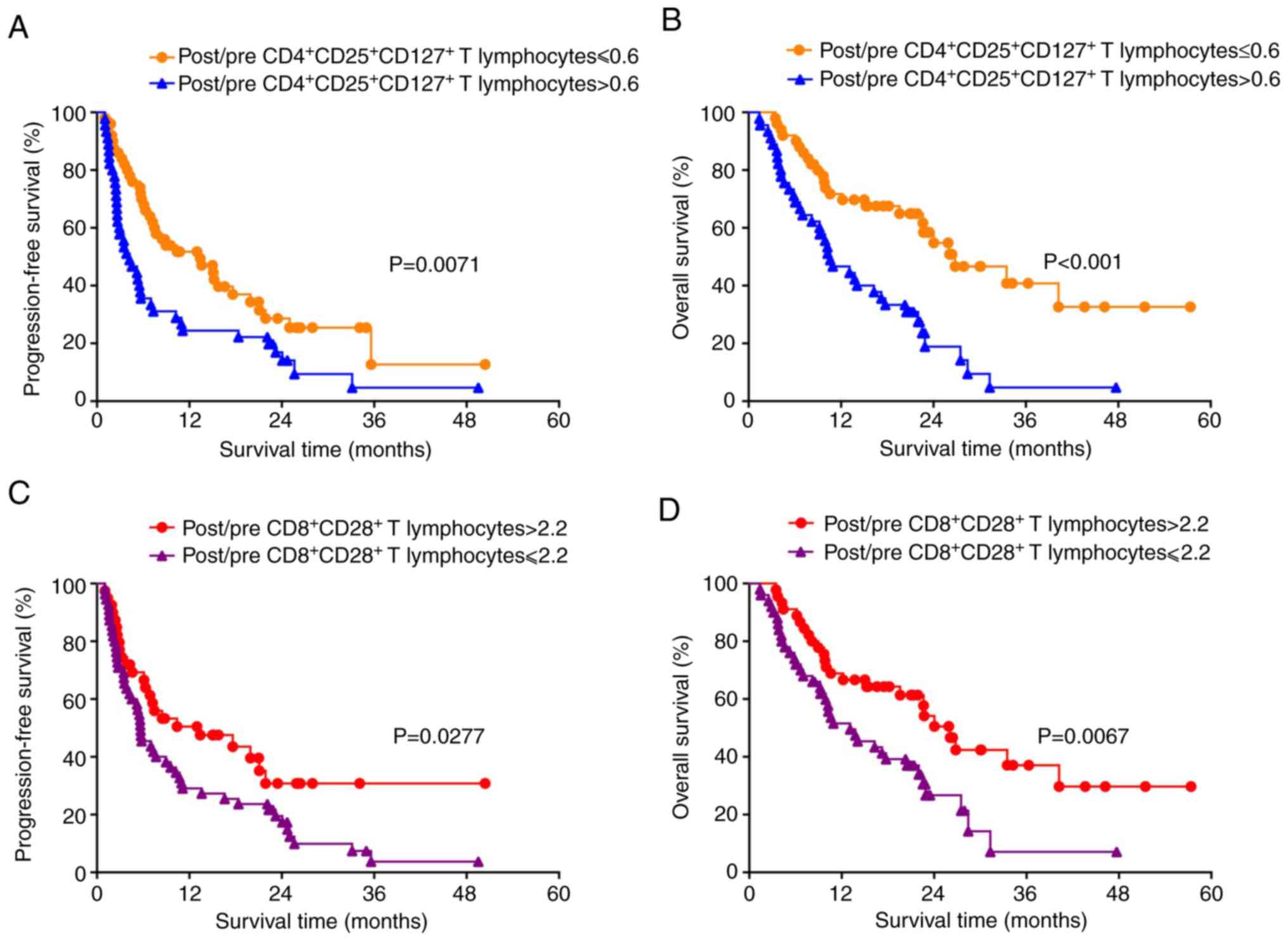 In our previous report, the role of DC-CIK infusion in patients with NSCLC was determined using a non-randomized control study design; the results demonstrated that the incorporation of DC-CIK into the standard anti-cancer treatment exhibited benefits for clinical responses (32). Therefore, the present study was performed to further analyze the expanded cell phenotype variations that may impact the cell yield. The results of the present study demonstrated that patients with a post/pre-culture CD8+CD28+ T lymphocyte ratio >2.2 and post/pre-culture CD4+CD25+CD127+ Treg ratio ≤0.6 exhibited significantly longer PFS and OS time.