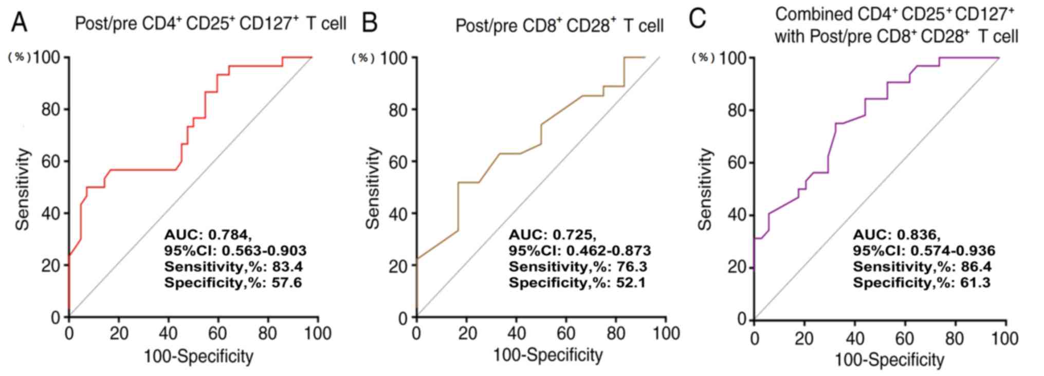 The performance of the post/pre-culture CD4+CD25+CD127+ Treg ratios, post/pre-culture CD8+CD28+ T cell ratios and the combined ratio of these T cell subtypes was evaluated to determine whether these ratios could predict different clinical outcomes in patients with NSCLC (Fig. 4). The analysis demonstrated that the combination of these T cell subtypes was a valuable marker in predicting the OS of patients with NSCLC (AUC, 0.836; 95% CI, 0.574–0.936; sensitivity, 86.4%; specificity, 61.3%). Details are provided in Fig. 4.