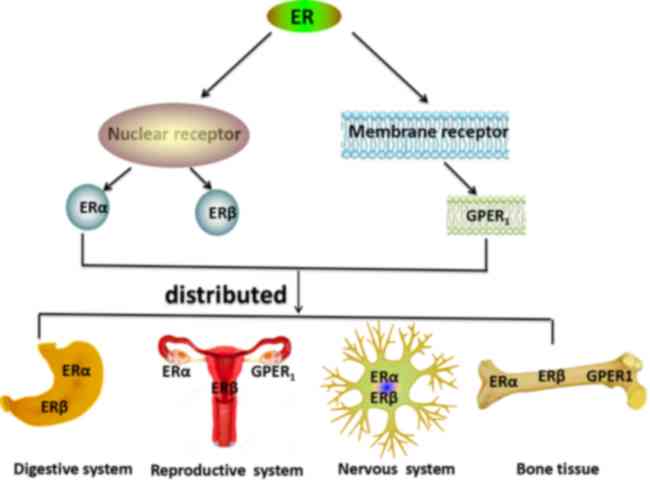 The estrogen receptor has three subtypes; estrogen receptor α (ERα), estrogen receptor β (ERβ), which belong to nuclear receptors and membrane receptors, such as G protein-coupled estrogen receptor 1 (GPER1, also known as GPR30), which mediate all of estrogens effects, and the expression of each receptor is largely tissue-type specific (3) (Fig. 1).