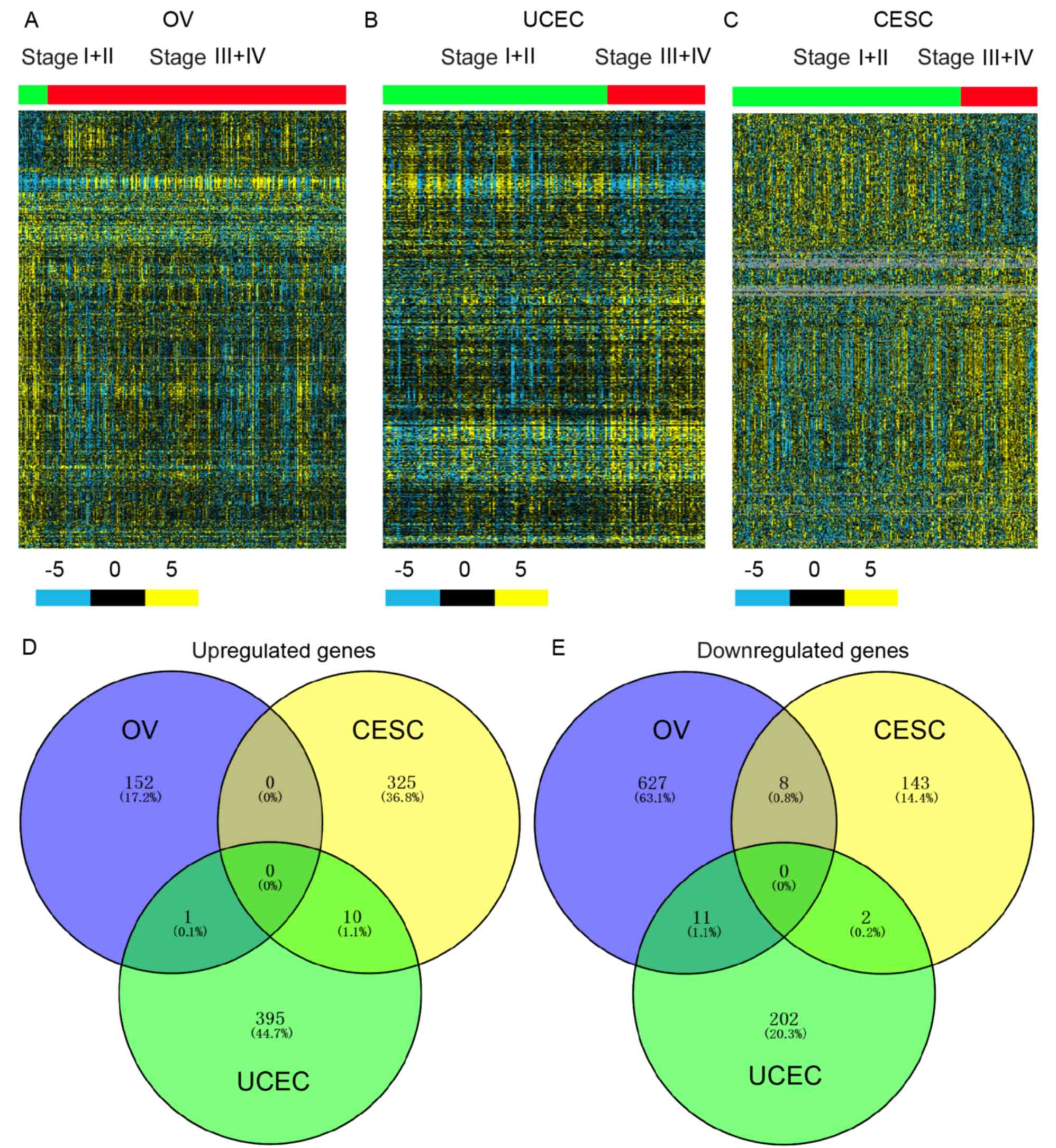 Datasets from TCGA were downloaded to identify DEGs in OV, CESC and UCEC progression. Gene expression with P<0.01 between low-stage (stage I + II) and advanced-stage (stage III + IV) samples was identified to indicate differential expression. A total of 153, 335 and 406 upregulated genes and 646, 153 and 215 downregulated genes were identified in OV, CESC and UCEC progression, respectively. Hierarchical clustering showed DEGs in higher-stage compared with lower-stage OV (Fig. 1A), CESC (Fig. 1B) and UCEC (Fig. 1C) samples.