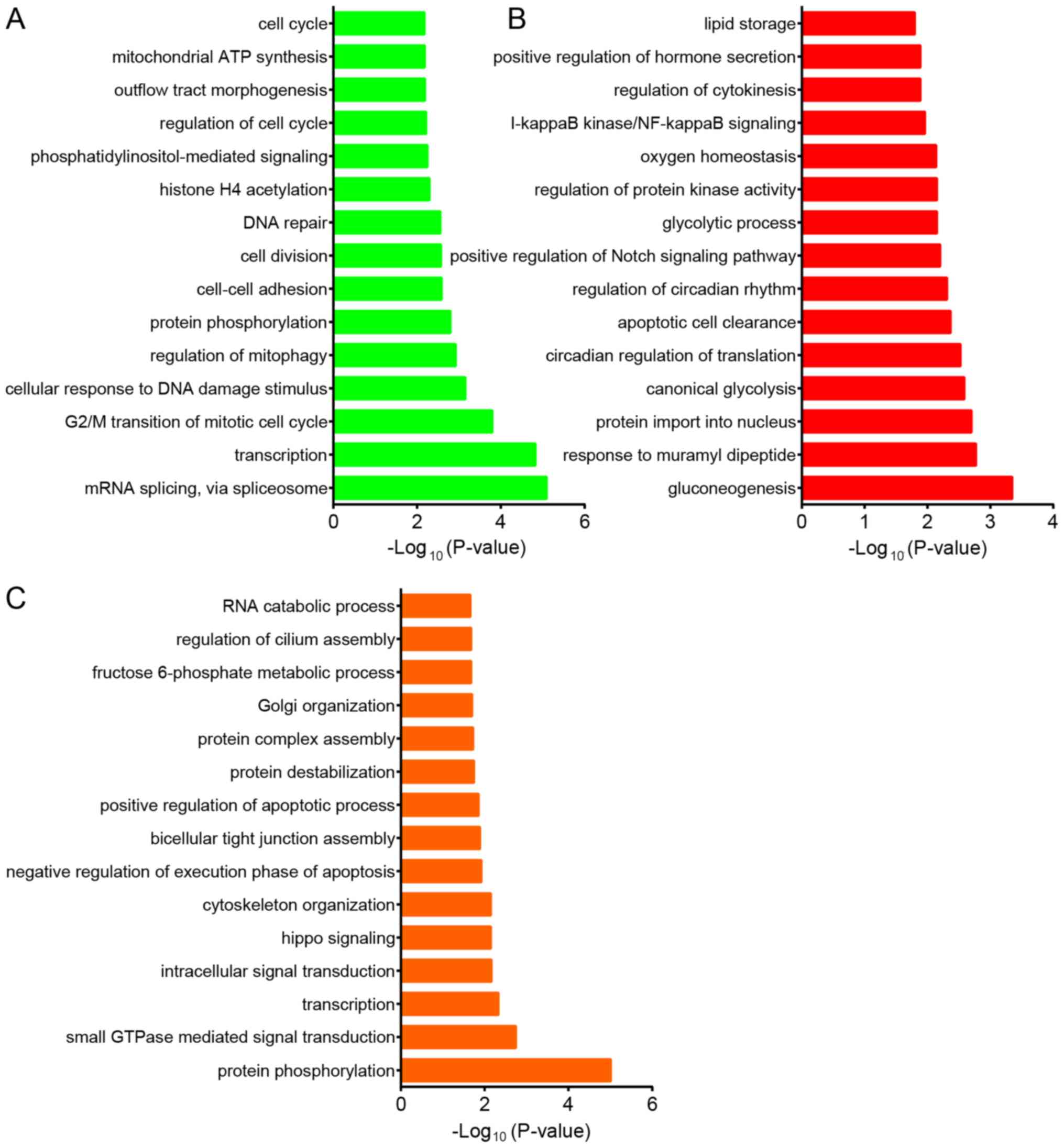 Next, bioinformatics analysis was performed on the DEGs in gynecological cancer. GO analysis revealed that the DEGs associated with OV progression were mainly involved in regulating ‘mRNA splicing’, ‘transcription’, ‘G2/M transition of mitotic cell cycle’, ‘cellular response to DNA damage stimulus’, ‘mitophagy’, ‘protein phosphorylation’, ‘cell-cell adhesion’, ‘cell division’ and ‘DNA repair’ (Fig. 2A). DEGs in CESC progression were mainly involved in regulating ‘gluconeogenesis’, ‘response to muramyl dipeptide’, ‘protein import into nucleus’, ‘canonical glycolysis’, ‘circadian regulation of translation’, ‘apoptotic cell clearance’, ‘positive Notch signaling pathway’, ‘glycolytic process’, ‘protein kinase activity’ and ‘oxygen homeostasis’ (Fig. 2B). The study also indicated that DEGs in UCEC were associated with ‘protein phosphorylation’, ‘small GTPase mediated signal transduction’, ‘transcription’, ‘intracellular signal transduction’, ‘hippo signaling’, ‘cytoskeleton organization’, ‘negative regulation of execution phase of apoptosis’, ‘bicellular tight junction assembly’, ‘positive regulation of apoptotic process’ and ‘protein destabilization’ (Fig. 2C).