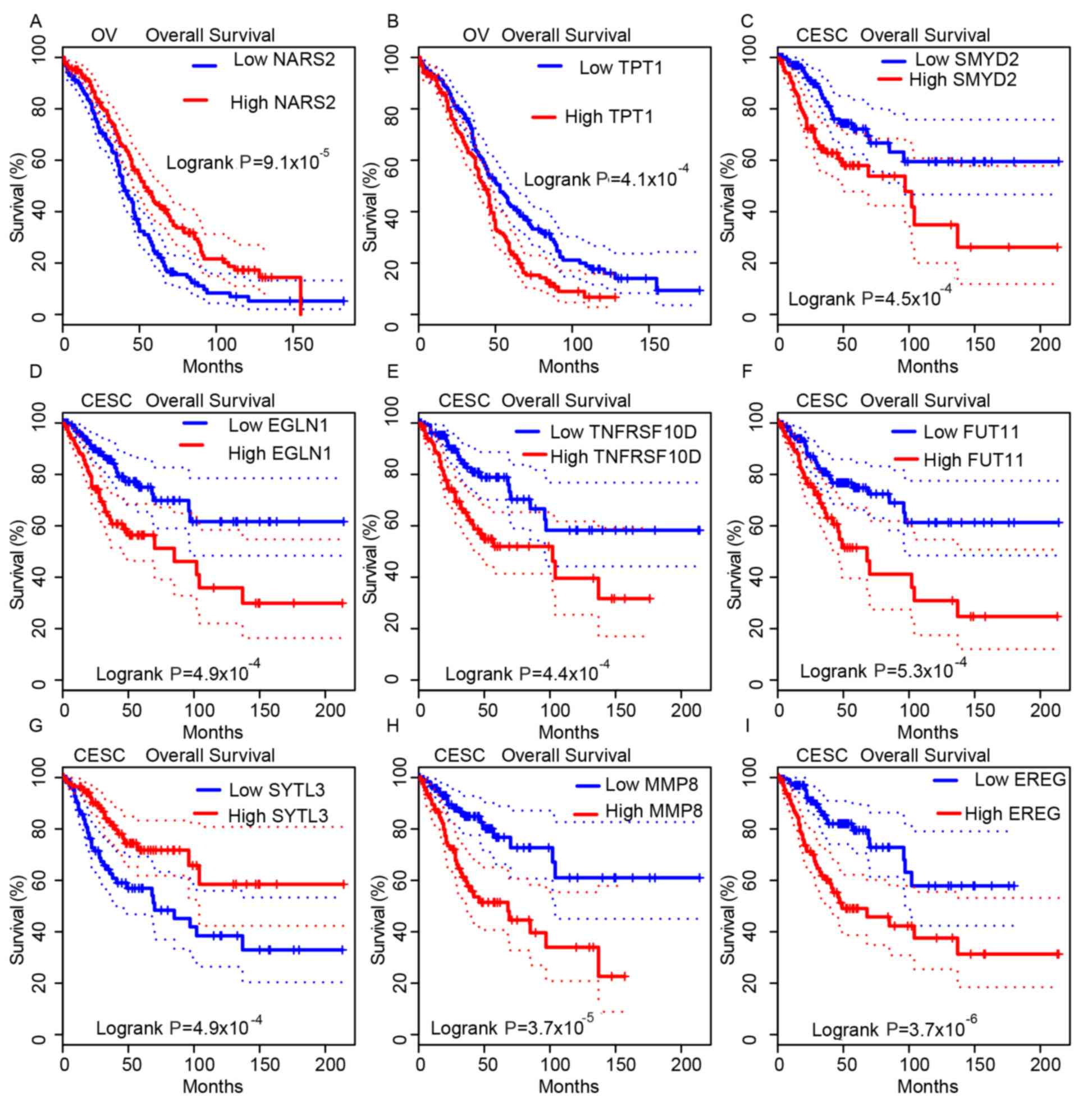 Gynecological cancer, including OV, CESC and UCEC, are a leading cause of cancer mortality in women (19). In the present study, TCGA datasets were analyzed to identify gynecological cancer progression-associated genes. A total of 153, 335 and 406 upregulated, and 646, 153 and 215 downregulated genes were associated with OV, CESC and UCEC progression, respectively. In addition, OV, CESC and UCEC progression-associated PPI networks were constructed to reveal the associations among these genes. Furthermore, Kaplan-Meier curve analysis showed that progression-related genes, such as SMYD2, EGLN1, TNFRSF10D, SLC5A1 and TXN, could serve as prognostic biomarkers for gynecological cancer.