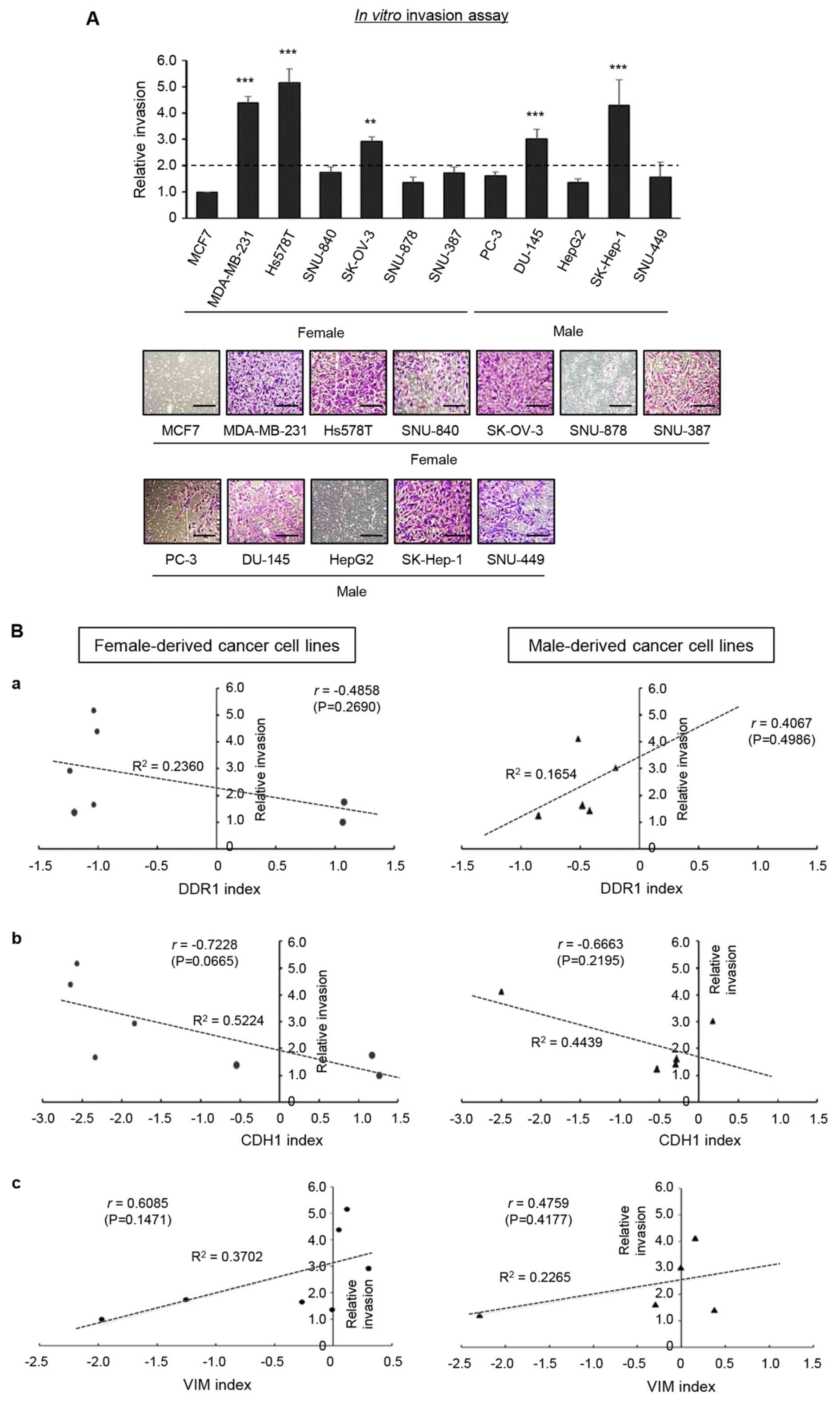 The differences in gene expression in regard to their association with the invasive phenotype of cancer cell lines was investigated in the present study. To this end, an in vitro transwell invasion assay was performed and the invasive ability from three independent experiments was quantified relative to the invasiveness of MCF7 cells (Fig. 2A). Since the MCF7 cell line is widely known to be non-invasive (43), the invasiveness of each cell line was compared to this cell line. The DDR1, CDH1 and VIM index was defined as the logarithmic value of each molecule divided by ZEB1, based on the mRNA data of ZEB1, CDH1, VIM and DDR1 obtained from the RT-PCR analysis, respectively (Fig. 1A and B). A plot of the relative invasion vs. DDR1 index revealed a negative correlation only in female-derived cell lines, and not in male-derived cell lines (Fig. 2B-a). A plot of the relative invasion vs. CDH1 index or VIM index revealed that the relative invasion was negatively correlated with CDH1 index and positively correlated with VIM index in both female- and male-derived cancer cell lines (Fig. 2B-b and B-c, respectively). Although the results were not of statistical significance, due to the limited number of samples, these results suggest that DDR1 index may have the potential to serve as an indicator of invasive phenotype of female-derived cancer cell lines. However, as there were no sex-specific differences observed in the correlations between invasion and CDH1 and VIM indices, these would not be suitable as invasive phenotype indicators.