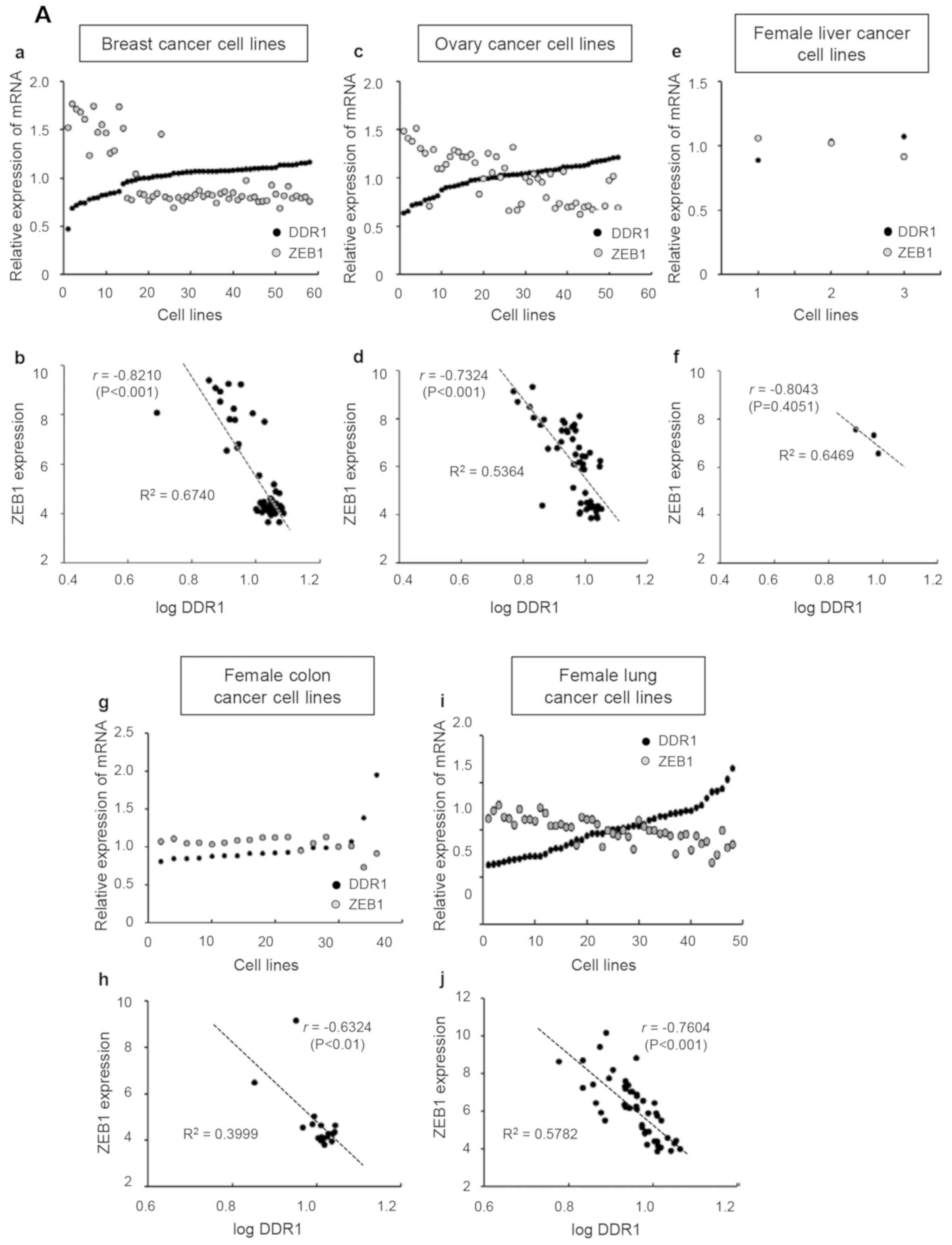 These data demonstrate that the correlation between DDR1 and ZEB1 revealed a negative tendency specific to female-derived cancer cell lines, although this was not statistically significant.