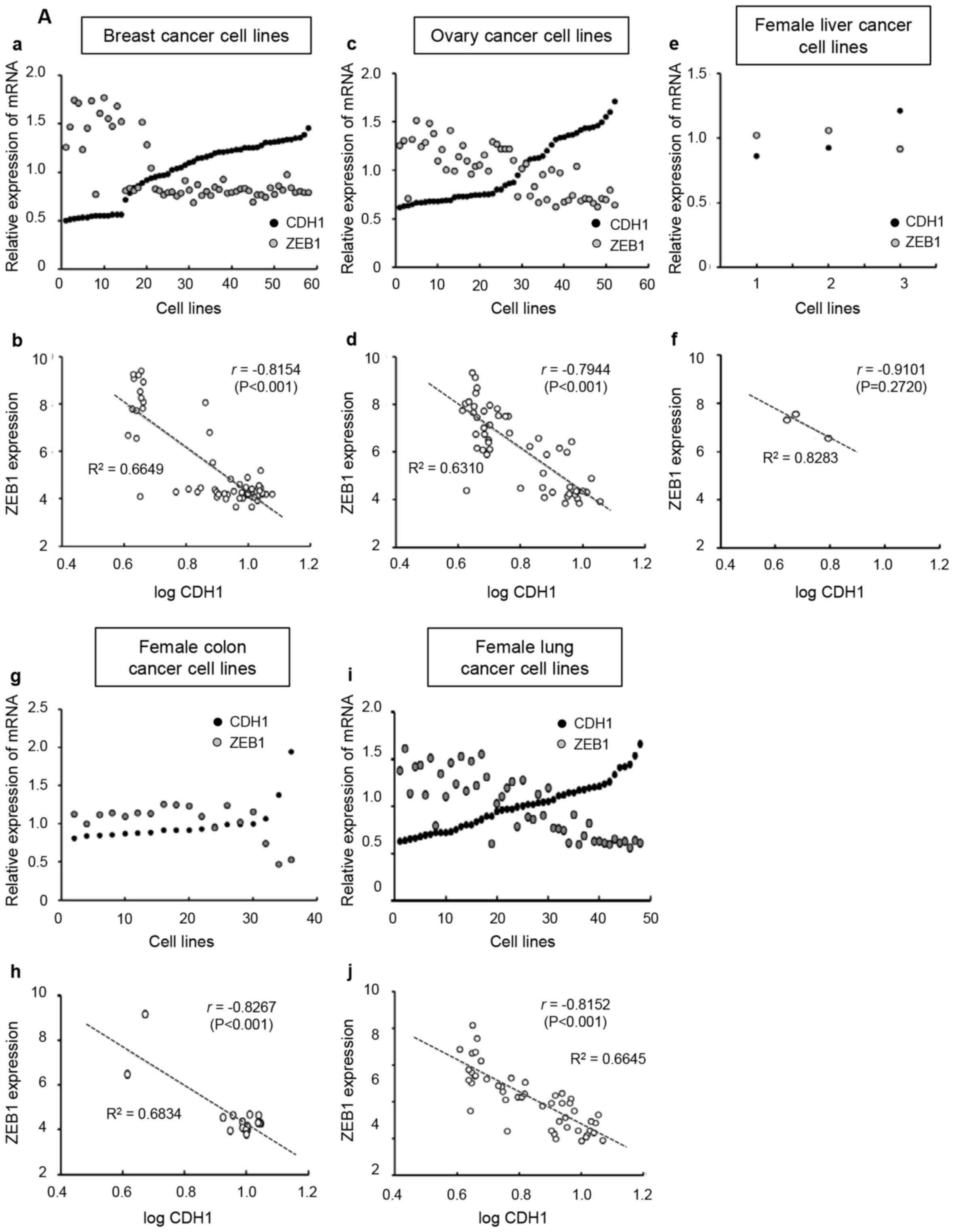 In female-derived cancer cell lines, the mRNA levels of ZEB1 were negatively correlated with CDH1 (Fig. 4A-a, A-c, A-e, A-g and A-i). The plot of log CDH1 and ZEB1 in these cell lines revealed a negative linear correlation (Fig. 4A-b, A-d, A-f, A-h and A-j). The r values of log CDH1 with ZEB1 in female breast-, ovary-, liver-, colon- and lung-derived cell lines were −0.8154 (P<0.001), −0.7944 (P<0.001), −0.9101 (P=0.2720), −0.8267 (P<0.001) and −0.8152 (P<0.001), respectively. The mRNA levels of ZEB1 in male-derived cancer cell lines were also negatively correlated with CDH1 (Fig. 4B-a, B-c, B-e and B-g). The plot of log CDH1 and ZEB1 in these cell lines revealed a negative linear association (Fig. 4B-b, B-d, B-f and B-h). The r values of the male prostate-, liver-, colon- and lung-derived cell lines were −0.7579 (P<0.05), −0.7583 (P<0.001), −0.8898 (P<0.001) and −0.7730 (P<0.001), respectively.