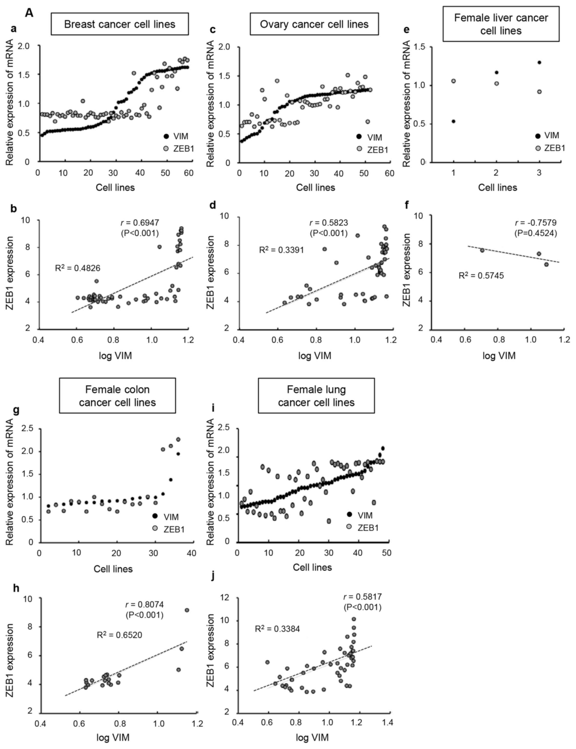 In the present study, the sex differences in the expression of EMT-associated genes CDH1, VIM, DDR1 and ZEB1 were investigated in various cancer cell lines. Furthermore, the gender specificity of the correlation between the expression of EMT-associated genes was also examined.