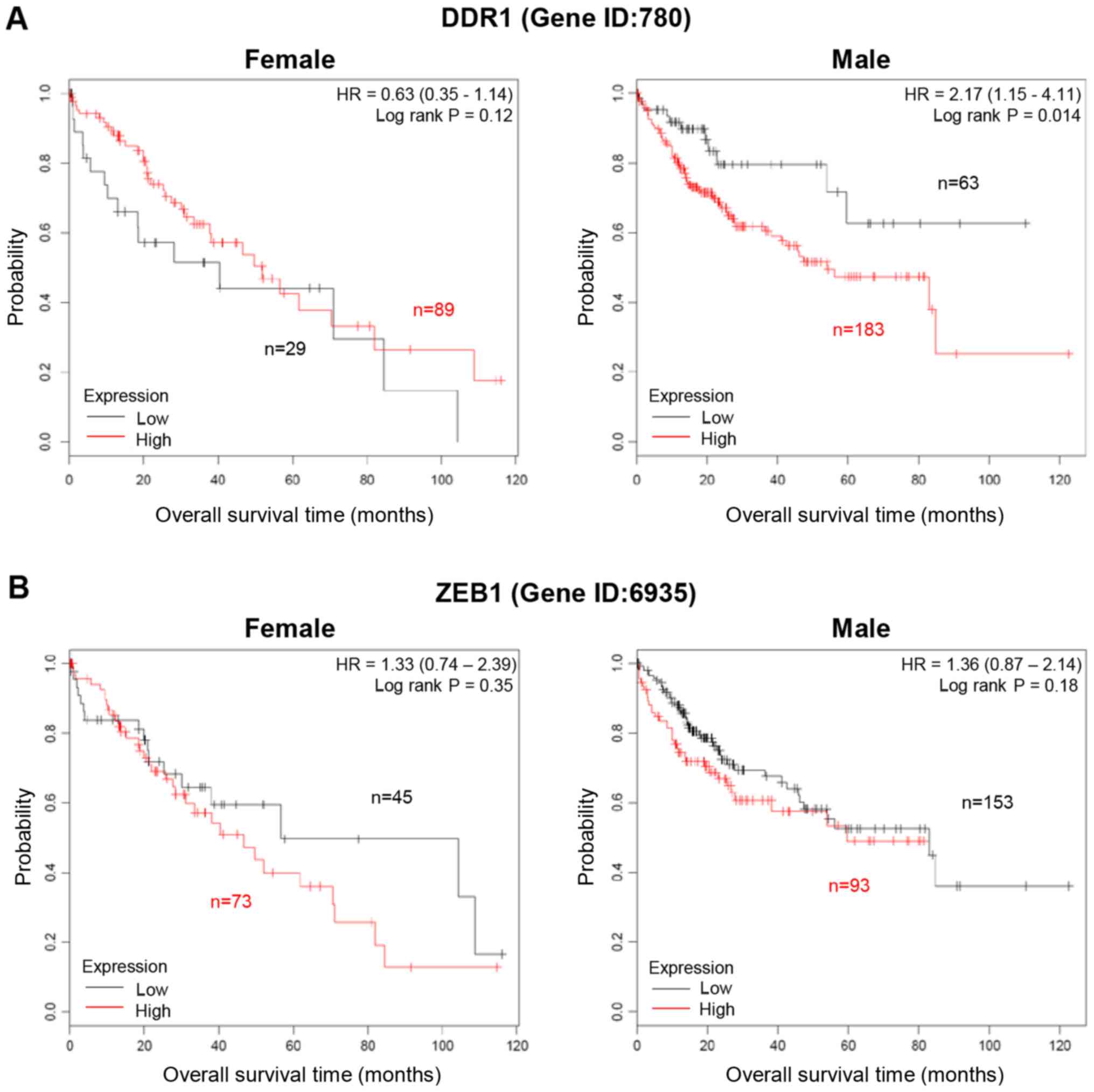 Analyses including the Kaplan-Meier survival curves were calculated and plotted by The Kaplan Meier Plotter (http://kmplot.com) using the transcriptomic datasets, the Gene Expression Omnibus (GEO; http://www.ncbi.nlm.nih.gov/geo/), the European Genome-phenome Archive (EGA; http://ega-archive.org/) and The Cancer Genome Atlas (TCGA; version 2016_01_28; http://cancergenome.nih.gov/) repositories (40,41). The data of female and male patients with liver cancer were split using the auto select best cutoff criteria. Median mRNA expression levels of DDR1 (female, 16.3903; male, 15.9004) and ZEB1 (female, 15.9808; male, 15.9159) were used to differentiate between high expression and low expression).