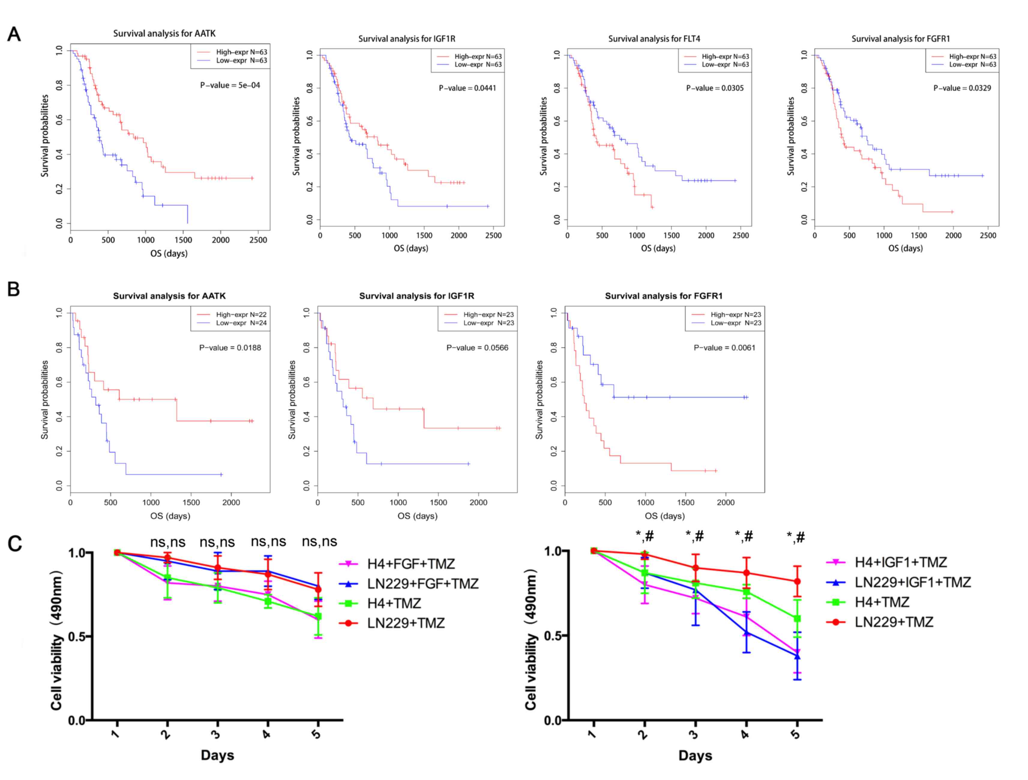 Among the collected samples, 126 primary high-grade glioma cases and 46 recurrent high-grade glioma cases had accessible survival information. Survival analysis indicated that high expression of IGF1R and AATK, and low expression of FLT4 and FGFR1 predicted longer overall survival time in primary glioma (Fig. 1A). In recurrent gliomas, high expression of AATK and IGF1R, and low expression of FGFR1 were associated with shorter overall survival time (Fig. 1B). Previous reports have indicated that the high expression of IGF1R is an independent prognostic factor in tumors, including glioma and breast cancer (24–27). Clinical reports have also suggested that high activation of the Met (HGFR) signaling pathway by HGF can increase crizotinib-sensitivity in lung cancer (22,24,25). Therefore, the RTK signaling pathway may influence treatment effectiveness. In the present study, FGF and IGF were used to stimulate tumor cells before TMZ treatment, and it was demonstrated that IGF stimulation assisted TMZ-induced tumor-cell death, whereas FGF did not induce sensitization to TMZ chemotherapy (Fig. 1C).