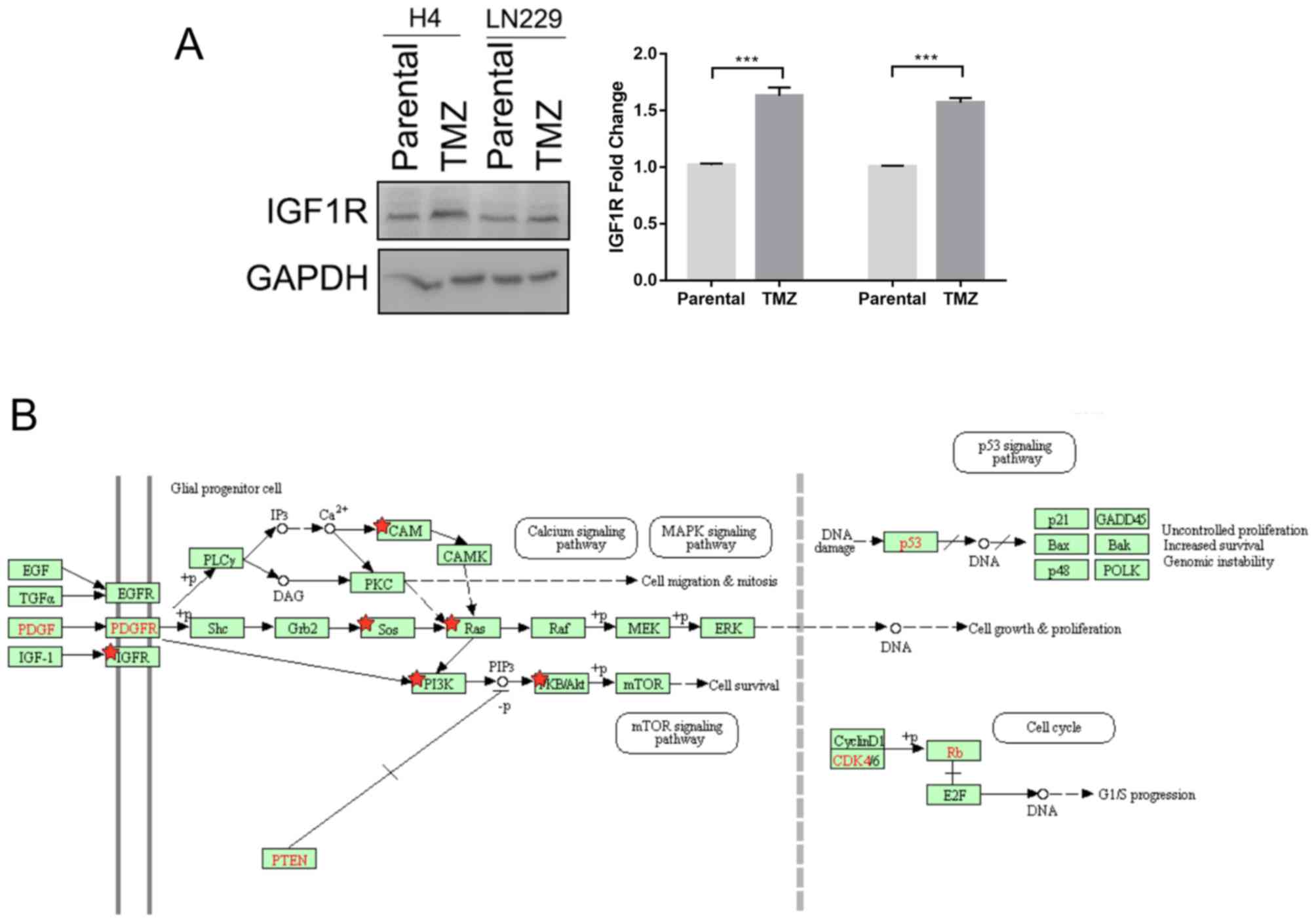 RNA sequencing data revealed that the expression of IGF1R was increased in recurrent gliomas following treatment, indicative of activation of the IGF1R signal pathway (Table II). This was confirmed in the present study, in which the expression level of IGF1R was demonstrated to be increased in glioma cells after TMZ treatment (Fig. 2A). Differential genes between primary high-grade gliomas and recurrent gliomas after chemoradiotherapy were identified, and used to perform pathway analysis. The results indicated that the IGF1R signaling pathway was activated by TMZ treatment. The PDGFR signaling pathway was also demonstrated to be activated. These pathways regulate the cell cycle and promote cell growth, which may result in tumor-cell sensitivity to chemoradiotherapy (Fig. 2B).