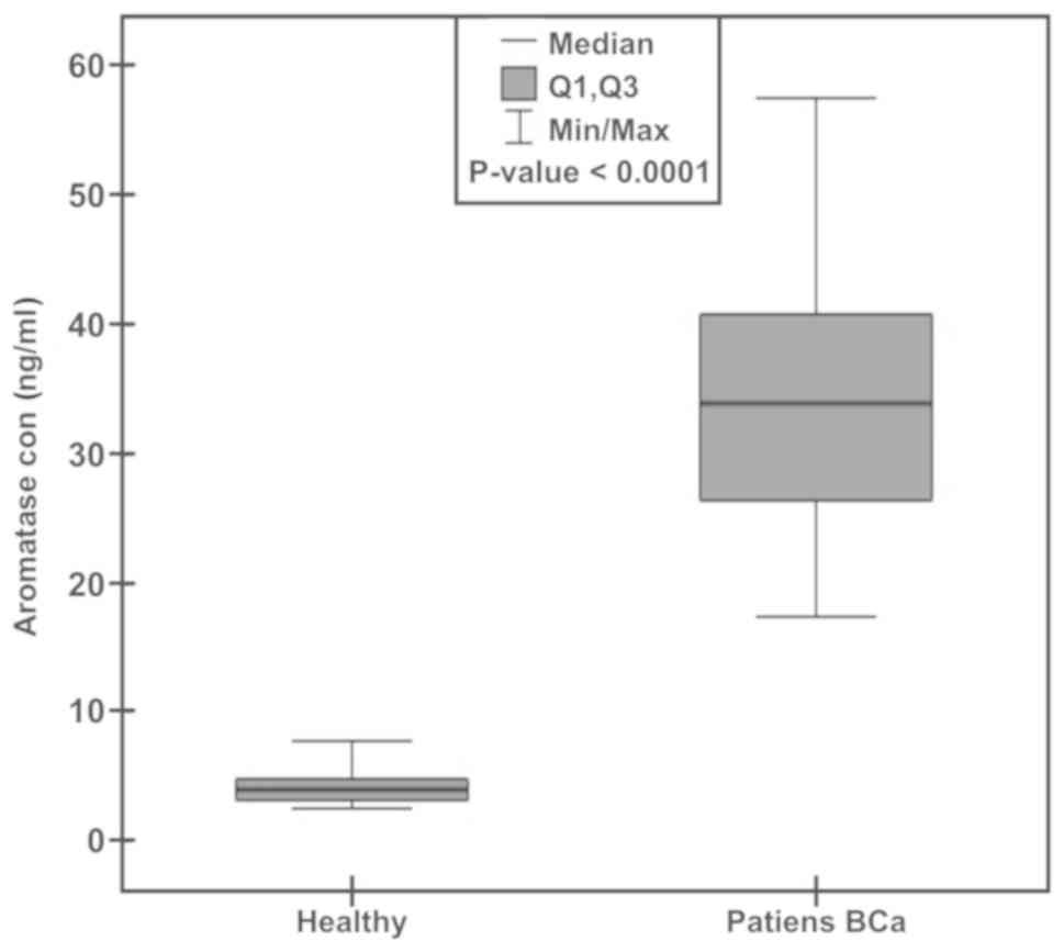 A significant difference in plasma concentration of aromatase was observed between patients with BCa and healthy subjects. The aromatase concentration in plasma of BCa patients and healthy donors ranged from 17.41–57.44 and 2.59–7.74 ng/ml respectively. The median value for healthy individuals reached 3.99 (an average of 4.3) while that of BCa patients amounted to 33.82 (an average of 33.98) (Fig. 1). This difference is highly statistically significant, with a P-value lower than 0.0001.