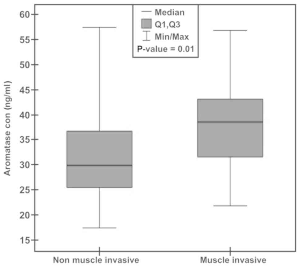 In conclusion, plasma aromatase may serve as an excellent biomarker of BCa with 100% sensitivity, 100% selectivity and an AUC value of the ROC curve equal to 1.0. Additionally, levels of plasma aromatase distinguish between muscle-invasive and non muscle-invasive BCa with a sensitivity of 60% and a specificity of 81%. The present study also determined the concentration of aromatase present in the plasma of healthy individuals and patients with BCa.