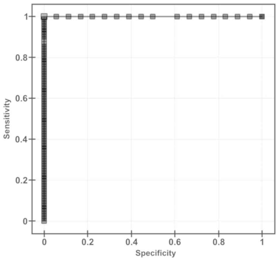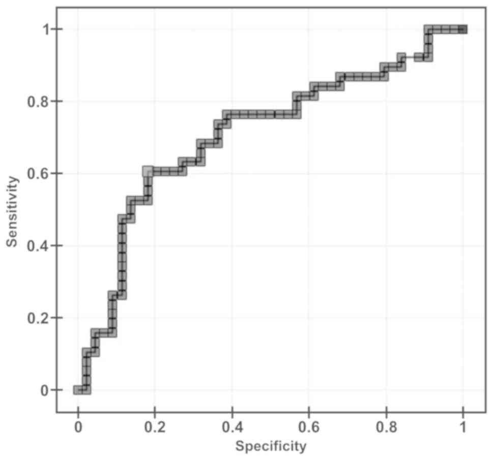 All results are given as the mean ± standard error of the mean (SEM), calculated on the basis of 12 repeated measurements. Statistical analyses were performed using Student's t-test and P<0.05 was considered to indicate a statistically significant difference. The receiver operating characteristic (ROC) curves with optimal cut-off points were calculated. Sensitivity, specificity, positive and negative predictive values were specified for cut-off points. All statistical analyses were performed using PQStat 1.6.4 Software.