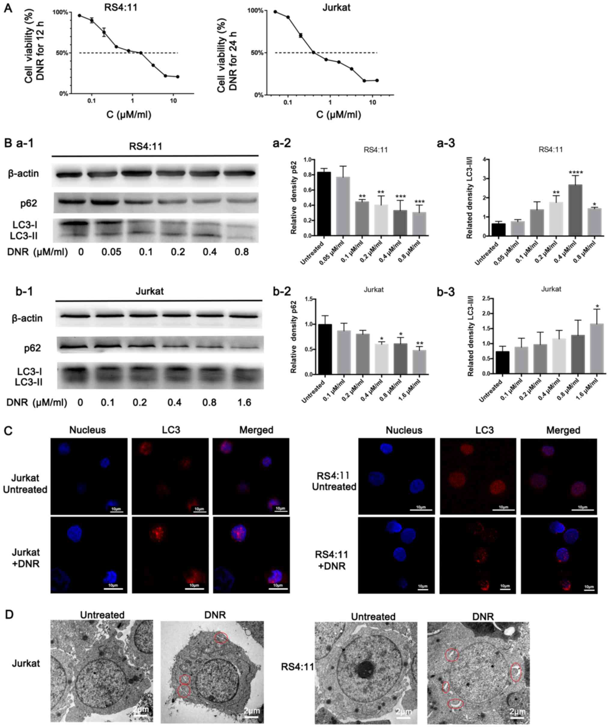 DNR is a major anti-tumour agent that is widely used to treat leukaemia. As presented in Fig. 1A, DNR significantly damaged the Jurkat and RS4:11 cells in a dose-dependent manner, particularly the RS4:11 cells, as RS4:11 cells were treated with DNR for 12 h only, while Jurkat cells were treated with DNR for 24 h. In order to investigate whether autophagy occurred when the leukaemia cells were treated with chemotherapeutic drugs, the present study conducted relevant experiments, and the results are presented below. Based on the western blot analysis, the chemotherapy-induced LC3-II/I ratio increased as the DNR concentration increased. The level of p62, an adaptor between the autophagy machinery and its substrates, gradually decreased as the drug concentrations increased (Fig. 1B). The immunofluorescence analysis revealed that the changes in endogenous LC3 puncta were consistent with the western blot analysis results in the two cell lines (Fig. 1C). Furthermore, the ultrastructural analysis revealed that chemotherapy-treated cells had more autophagosomes and autophagolysosomes during chemotherapy compared with the untreated cells in both cell lines (Fig. 1D). Fig. 1 demonstrates that the chemotherapeutic drugs induced autophagy in the leukaemia cells.