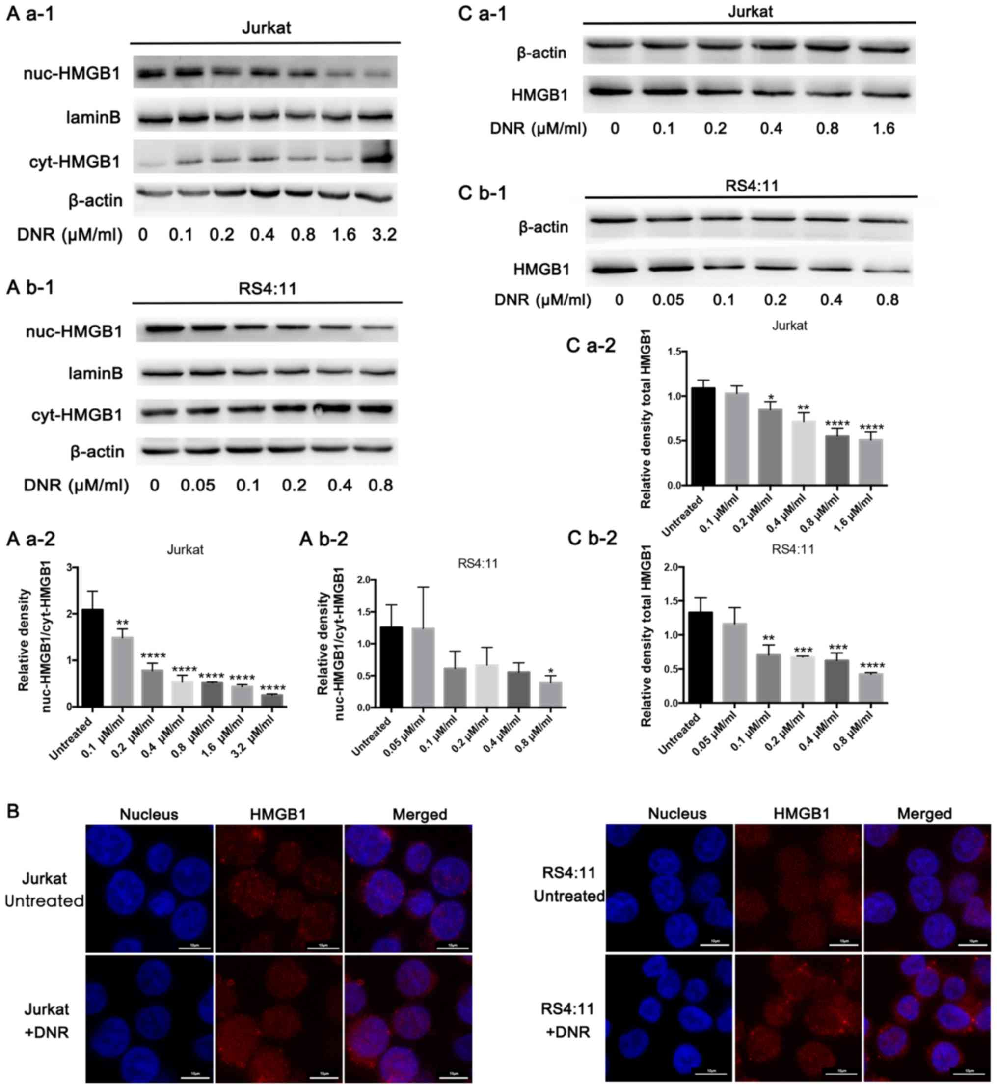 Jurkat cells were treated with DNR (0, 0.05, 0.1, 0.2, 0.4, 0.8, 1.6, 3.2 or 6.4 µM/ml) or DNR (0.4 µM/ml) for 24 h. In the pre-experiment, Jurkat and RS4:11 cells were treated with DNR for 24 h, however it was revealed that RS4:11 cells were in a very poor state and almost all cells died, which affected the stability of the experimental results (data not shown). Therefore, in the subsequent experiments, RS4:11 cells were treated with DNR (0, 0.05, 0.1, 0.2, 0.4, 0.8, 1.6, 3.2 or 6.4 µM/ml) or DNR (0.4 µM/ml) for 12 h. Jurkat cells were transfected with lentivirus, and HMGB1NC, HMGB1MT1, HMGB1MT2 and HMGB1WT cells were treated with or without DNR (0.4 µM) for 24 h.