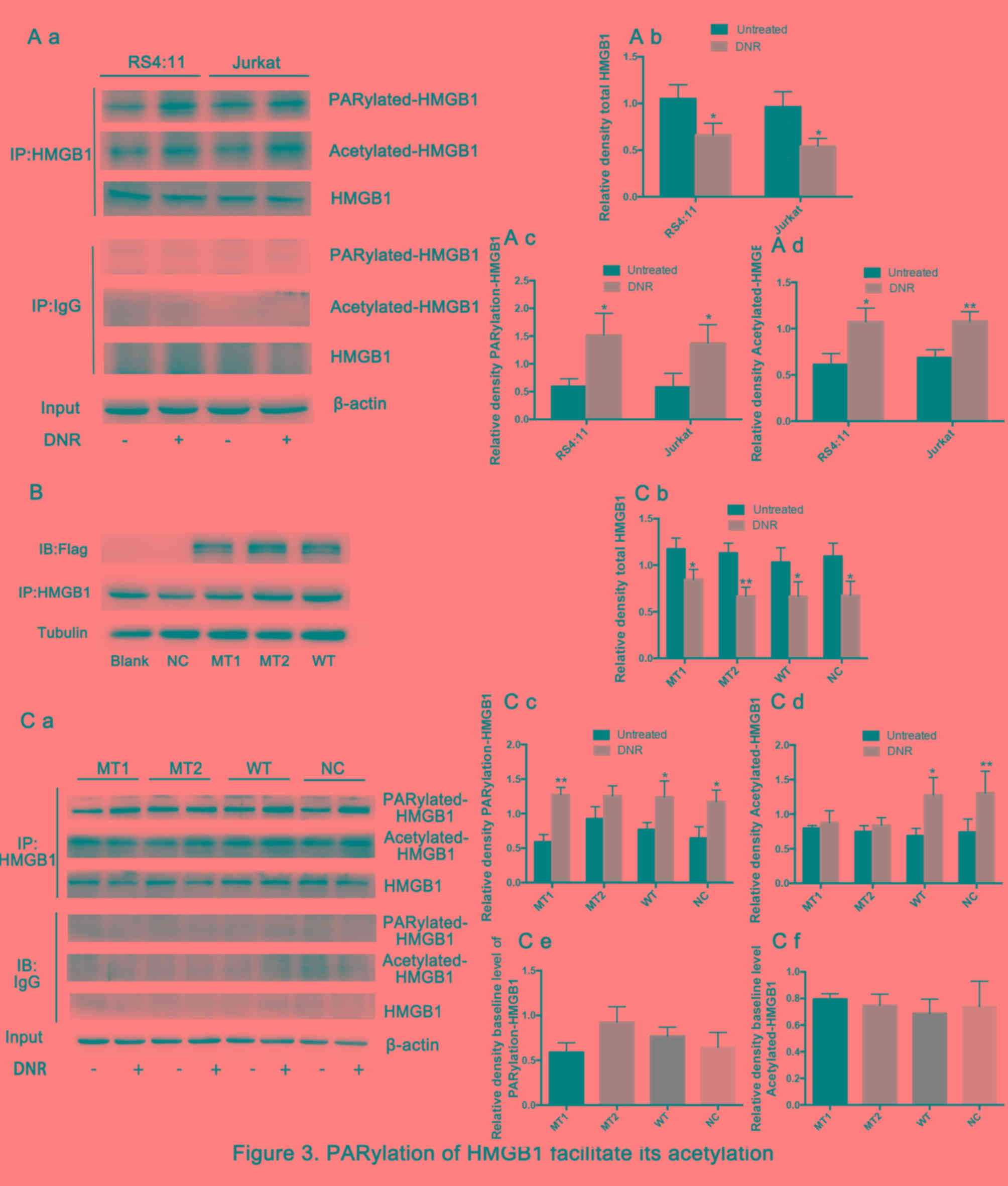 An increasing number of studies have demonstrated that acetylation or poly (ADP-ribosylation) can promote HMGB1 translocation, but few studies have addressed the interaction between these modifications. Recently, Yang et al (27) reported for the first time that PARP1 can promote HMGB1 acetylation through poly (ADP-ribosylation). However, the association between poly (ADP-ribosylation) and acetylation and the role of these modifications in HMGB1 translocation in leukaemia remain unclear. Figs. 3B and 4A and B demonstrate that in HMGB1MT1 cells, although the level of poly (ADP ribosylation) modification increased, HMGB1 expression in the cytoplasm did not increase compared with that in the untreated group, and no changes occurred in the sublocalisation of HMGB1 via immunofluorescence. This suggests that poly (ADP ribosylation) modification of HMGB1 facilitates its acetylation but is insufficient to induce HMGB1 translocation. The present study hypothesised that the possible mechanism for this poly (ADP-ribosylation)/acetylation-controlled distribution was that the poly ADP-ribosylation of the glutamic acid residues altered the conformation of the A box, thereby exposing the acetylation site and promoting acetylation of the lysine residues in HMGB1. These HMGB1 modifications decrease its ability to bind to DNA and promote its translocation.