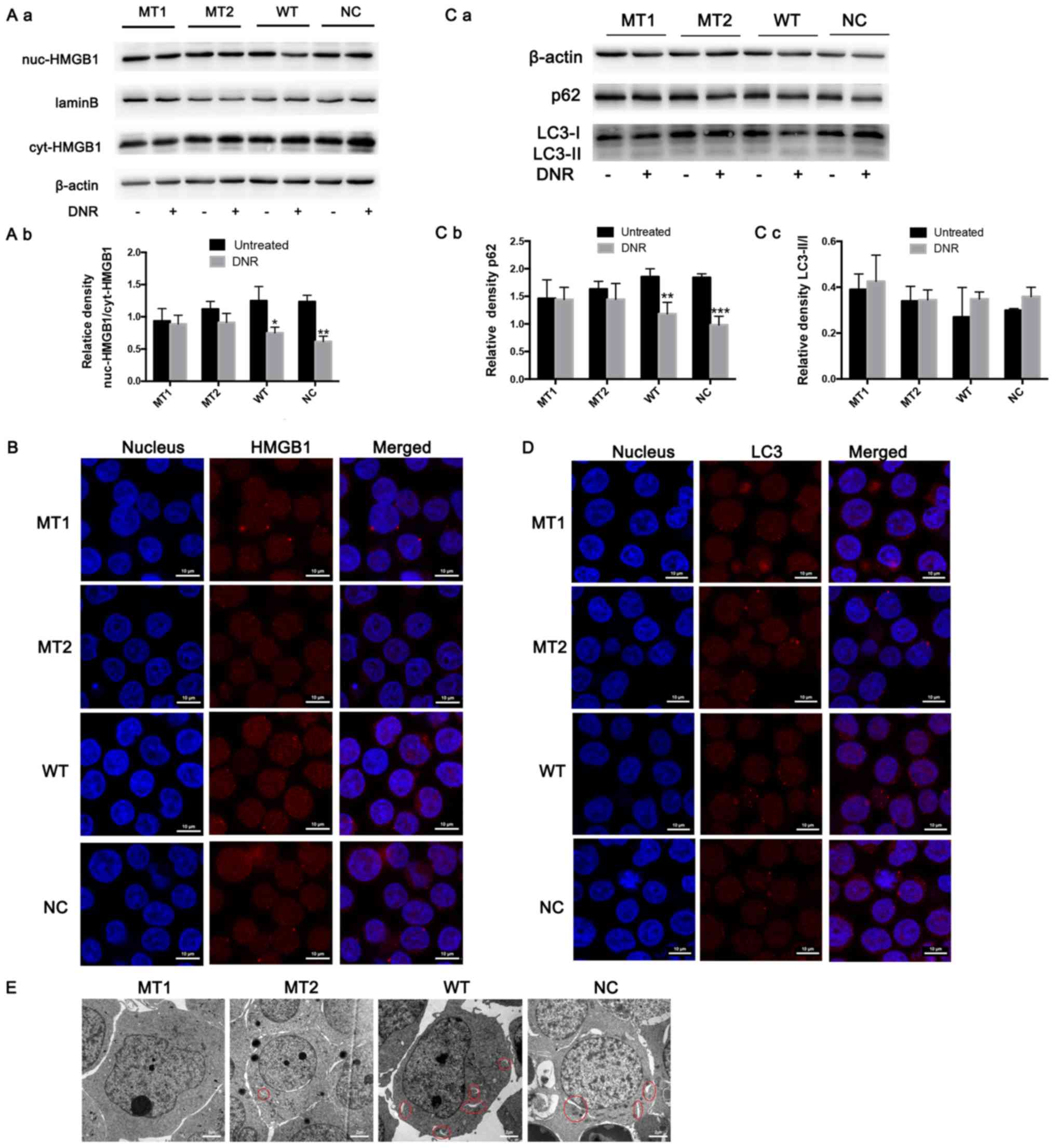 HMGB1 expression in the nucleus and cytoplasm was detected via western blotting. The results revealed that HMGB1 expression was significantly increased in the cytoplasm of HMGB1WT and HMGB1NC cells following DNR treatment; however, the HMGB1 expression in the nucleus and cytoplasm of HMGB1MT1 and HMGB1MT2 cells did not change significantly (Fig. 4A). In addition, following immunofluorescence labelling of HMGB1, red fluorescence was observed in the nucleus and cytoplasm of the HMGB1WT and HMGB1NC cells following DNR treatment. However, in the HMGB1MT1 and HMGB1MT2 cells, the red fluorescence in the cytoplasm was weaker than that in the HMGB1WT and HMGB1NC cells following DNR treatment (Fig. 4B). To further demonstrate that HMGB1 translocation is associated with chemotherapy-induced autophagy, the present study conducted relevant experiments. The western blot analysis revealed that the LC3-II/I ratio increased (but not significantly) and that p62 levels decreased following DNR treatment in the HMGB1WT and HMGB1NC cells, while the LC3-II/I ratio and p62 level did not change significantly in the HMGB1MT1 or HMGB1MT2 cells (Fig. 4C). Immunofluorescence revealed that the changes in endogenous LC3 puncta indicated increased autophagy levels in the HMGB1WT and HMGB1NC cells, while the autophagy levels of the HMGB1MT1 and HMGB1MT2 cells remained low (Fig. 4D). Compared with the HMGB1WT and HMGB1NC cells, fewer autophagosomes and autophagolysosomes were observed in the HMGB1MT1 and HMGB1MT2 cells following chemotherapy, which was the same as the trend observed in the immunofluorescence analysis (Fig. 4E). Blocking the acetylation and poly (ADP-ribosylation) of HMGB1 significantly decreased the translocation of HMGB1 from the nucleus to the cytoplasm and inhibited the induction of autophagy during chemotherapy in Jurkat cells (Fig. 4). Combined with the data in Figs. 3 and 4, these results demonstrate that poly (ADP-ribosylation) of HMGB1 facilitated its acetylation, thereby inducing HMGB1 translocation and ultimately promoting chemotherapy-induced autophagy in leukaemia cells.