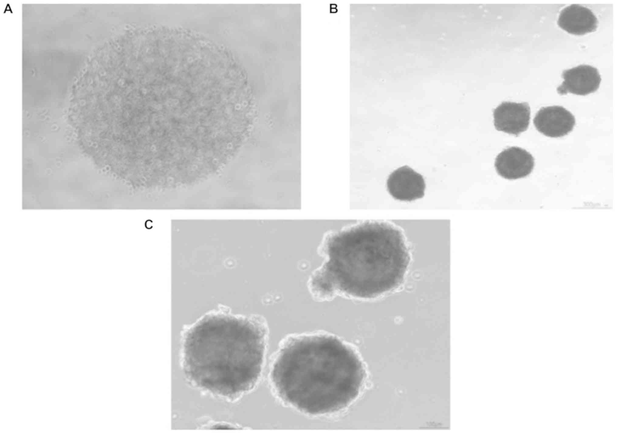 Recently it is known that CSC may also originate from differentiated cells and nonCSC, and there are different phenotypes of CSC, displaying genetic heterogeneity (37,38). Almeida et al (39) defined holospheres, merospheres and paraspheres in HNSCC cell lines and suggested that CSCs with enhanced stemness and invasive potential are a specific population that exist in holospheres. Our morphological data also displayed highly dark and dense holospheres of CSCs.