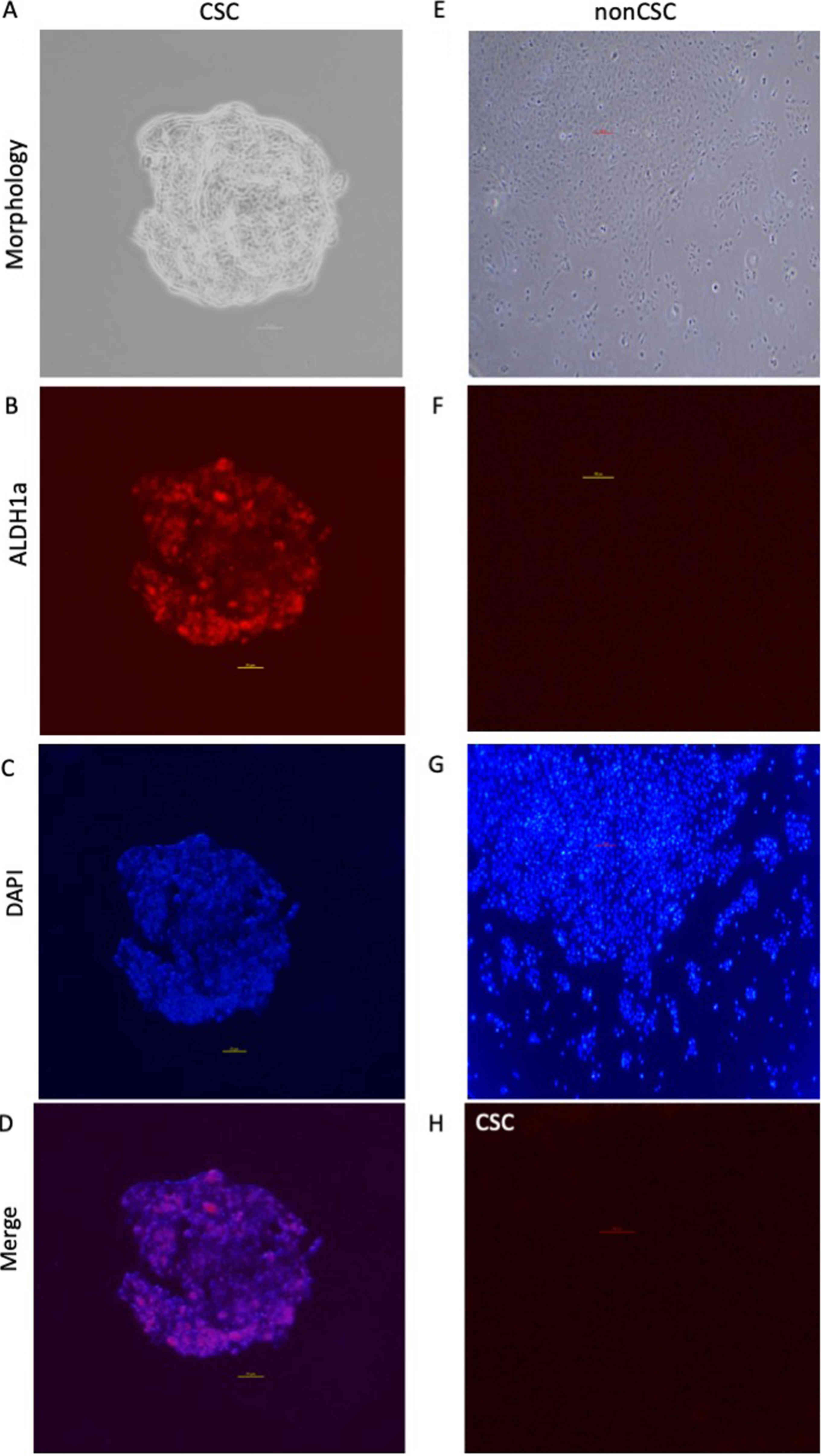 For both cell type mouse Anti-ALDH1A1 (ab105920; Abcam) antibody was used for immunofluorescence staining. As expected, while ALDH1a expression could be observed in CSC spheres, there was no ALDH1a expression in nonCSC. This result confirmed the successful isolation of CSCs. In CSC ALDH1a expression was specific to spheroid formation. Negative control (no primary antibody) didn't display any ALDH1a expression for both cell lines representing clearance of undesired background staining. DAPI could be detected for both cell type, displaying different patterns for CSC and nonCSC (Fig. 2).