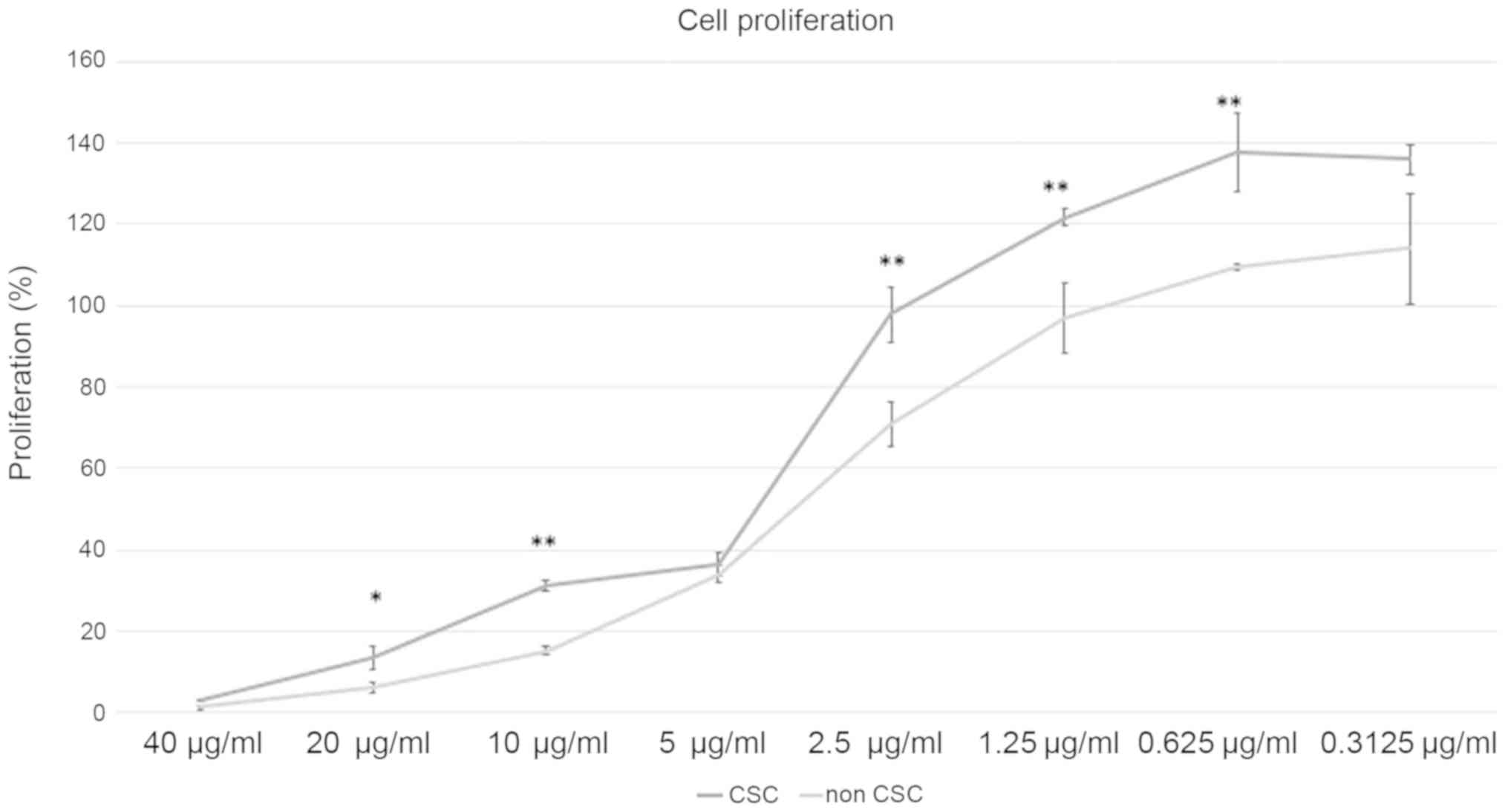 As CSC are thought to be resistant to chemotherapeutics we confirmed their proliferation compared to nonCSC after cisplatin treatment. We applied different doses of cisplatin between 40 to 0.3125 µg/ml. Our results displayed CSC to be more resistant to cisplatin (Fig. 4). For 20, 10, 2.5, 1.25, 0.625 µg/ml cisplatin treatment, cell proliferation percentages were significantly higher in CSC. P-values for these dosages were respectively P=0.017, P=0.0006, P=0.006, P=0.008, P=0073. For dosages of 5 and 0.3125 µg/ml cell proliferation rates weren't significant, P=0.32 and P=0.06 respectively.