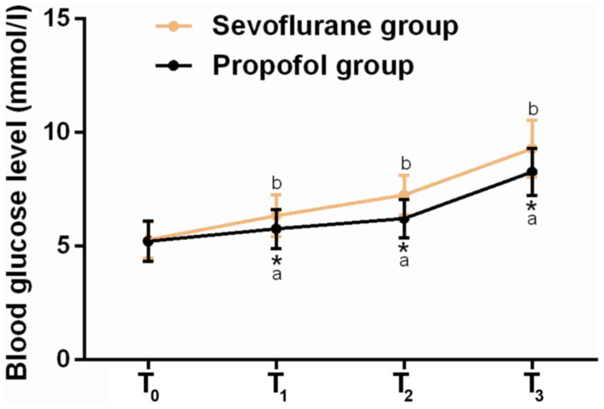 The results on blood glucose levels showed that there was no significant difference between blood glucose levels of the patients in the propofol group and those in the sevoflurane group before they were anesthetized (T0). After surgery, the blood glucose levels of the patients gradually increased and were significantly higher than those before the patients were anesthetized. In addition, the blood glucose levels of the patients in the propofol group were significantly lower than those in the sevoflurane group. This result indicates that the effect of propofol was less than that of sevoflurane on glucose metabolism and the stress response of propofol was less than that of sevoflurane to surgical stimulation. A report on anesthetic management by Kitamura et al (20) demonstrated that the blood glucose levels of the patients in the propofol group were significantly higher than those in the sevoflurane group within 4 h after the patients were anesthetized, similarly to the results of the present study. Our results on hemodynamic indicators showed that there was no significant difference in HR, SpO2, SBP and MBP of the patients in the two groups. Compared with the hemodynamic indicators before the patients were anesthetized (T0), the hemodynamic indicators decreased slightly and then increased after the surgery was started. There was no significant difference between the hemodynamic indicators of the patients in two groups after surgery was finished and those before surgery. This result indicates that the hemodynamic indicators of the patients in two groups were stable. Khare et al (21) studied the anesthesia of laparoscopic cholecystectomy, and found that SBP, DBP and MBP of the patients in the propofol group decreased in different periods compared with those in the sevoflurane group; however, there was no significant difference between the two groups. The hemodynamic indicators of the patients in two groups were stable. This result was similar to the results of our study. In this study, the results on inflammatory factors showed that there was no significant difference between baseline inflammatory factor indicators in the propofol group and those in the sevoflurane group. The levels of serum inflammatory factors IL-1β, IL-6, IL-10 and TNF-α were first increased, then decreased, and gradually returned to the preoperative level after the surgery was finished. The levels of IL-1β, IL-6 and IL-10 in the propofol group were lower than those in the sevoflurane group after pneumoperitoneum was carried out for 5 min. This result indicates that the effect of propofol is better than that of sevoflurane on reducing serum inflammatory factors. A study on propofol or sevoflurane combined with remifentanil was carried out by Shen et al (22) showing that the levels of serum IL-1β, IL-6 and TNF-α in the propofol and the sevoflurane group after surgery were significantly higher than those before surgery, and the levels of serum IL-1β, IL-6 and TNF-α in the propofol group were significantly lower than those in the sevoflurane group. These results suggested that remifentanil combined with propofol could reduce the concentration of serum inflammatory factors effectively in accordance to the results of the present study. The MMSE cognitive function scores showed that there was no significant difference between MMSE cognitive function scores in the propofol group and those in the sevoflurane group before the patients were anesthetized. MMSE cognitive function scores in the propofol and the sevoflurane group at 6 h after the beginning of surgery were significantly lower than those before the anesthetization of patients. MMSE cognitive function scores in the propofol group were significantly higher than those in the sevoflurane group at 6 h after the surgery was started. There was no significant difference between MMSE cognitive function scores in the propofol and the sevoflurane group at T5 and those before the anesthetization of patients. This result indicates that the effect of propofol is less than that of sevoflurane on the cognitive function of patients with T2DM and GC. A study on effects of propofol and sevoflurane on the cognitive function of elderly patients (23), showed that propofol and sevoflurane had similar effects; however, the effect of propofol was less than that of sevoflurane on the cognitive function. This result is similar to the results of the present study. The results on the anesthetic effect showed that the time of spontaneous breath, eye opening, extubation, and verbal response in the propofol group were significantly shorter than those in the sevoflurane group, indicating that the anesthetic effect and analepsia quality of propofol are better than those of sevoflurane for patients with T2DM and GC. A study has shown that compared with general anesthesia, propofol or sevoflurane combined with epidural block is conducive in improving the analepsia quality of elderly patients with GC after undergoing anesthesia of radical surgeries, increases the stability of the patients' hemodynamics and shortens their awakening time (24). In the present study, the results on adverse reactions showed that the patients had adverse reactions, such as nausea, vomiting, cough and restlessness in the propofol and the sevoflurane group. The number of patients with nausea and vomiting in the propofol group was significantly less than that in the sevoflurane group, and the incidence of adverse reactions in the propofol group was significantly lower than that in the sevoflurane group. This result suggests that side effects of propofol might be less than those of sevoflurane, and adverse impacts of propofol are less than those of sevoflurane. A study on anesthetic postoperative pain was carried out by Peng et al (25), showing that the patients who were anesthetized with propofol needed less postoperative rescue analgesics than that of patients anesthetized with sevoflurane, and the execution time of postope