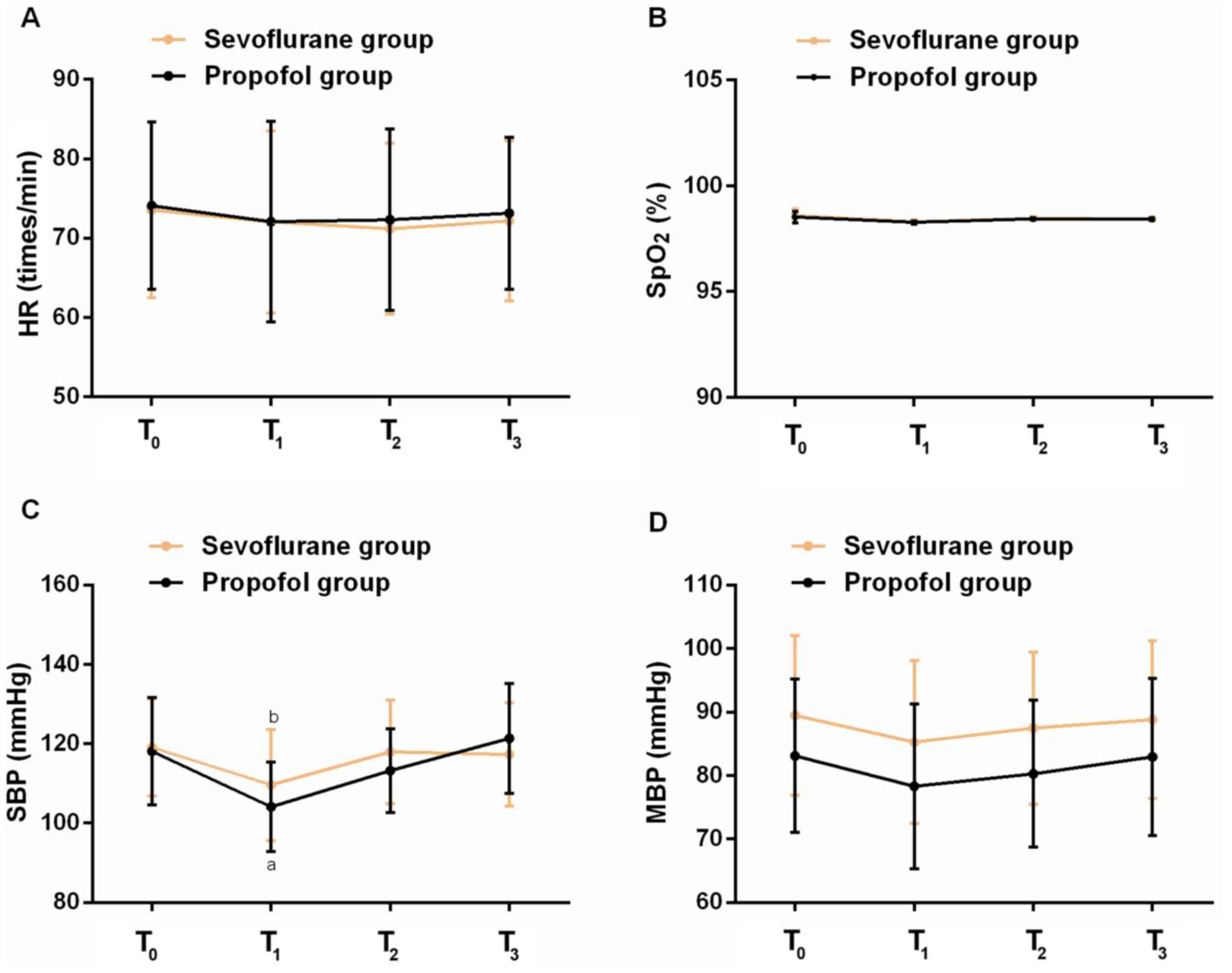 In order to investigate the effects of propofol and sevoflurane on the hemodynamic indicators, the hemodynamic indicators HR, SpO2, SBP and MBP were observed and compared in the propofol and the sevoflurane group at T0, T1, T2, and T3. The results showed that there was no significant difference in HR, SpO2, SBP and MBP of the patients in two groups at T0, T1, T2 and T3 (P>0.05). Compared with the hemodynamic indicators at T0, the hemodynamic indicators of the patients in the propofol and sevoflurane group decreased at approximately T1, whereas they increased at T2. There was no significant difference between the hemodynamic indicators of the patients in the propofol and sevoflurane group at T3 or T0 (P>0.05) (Fig. 2).