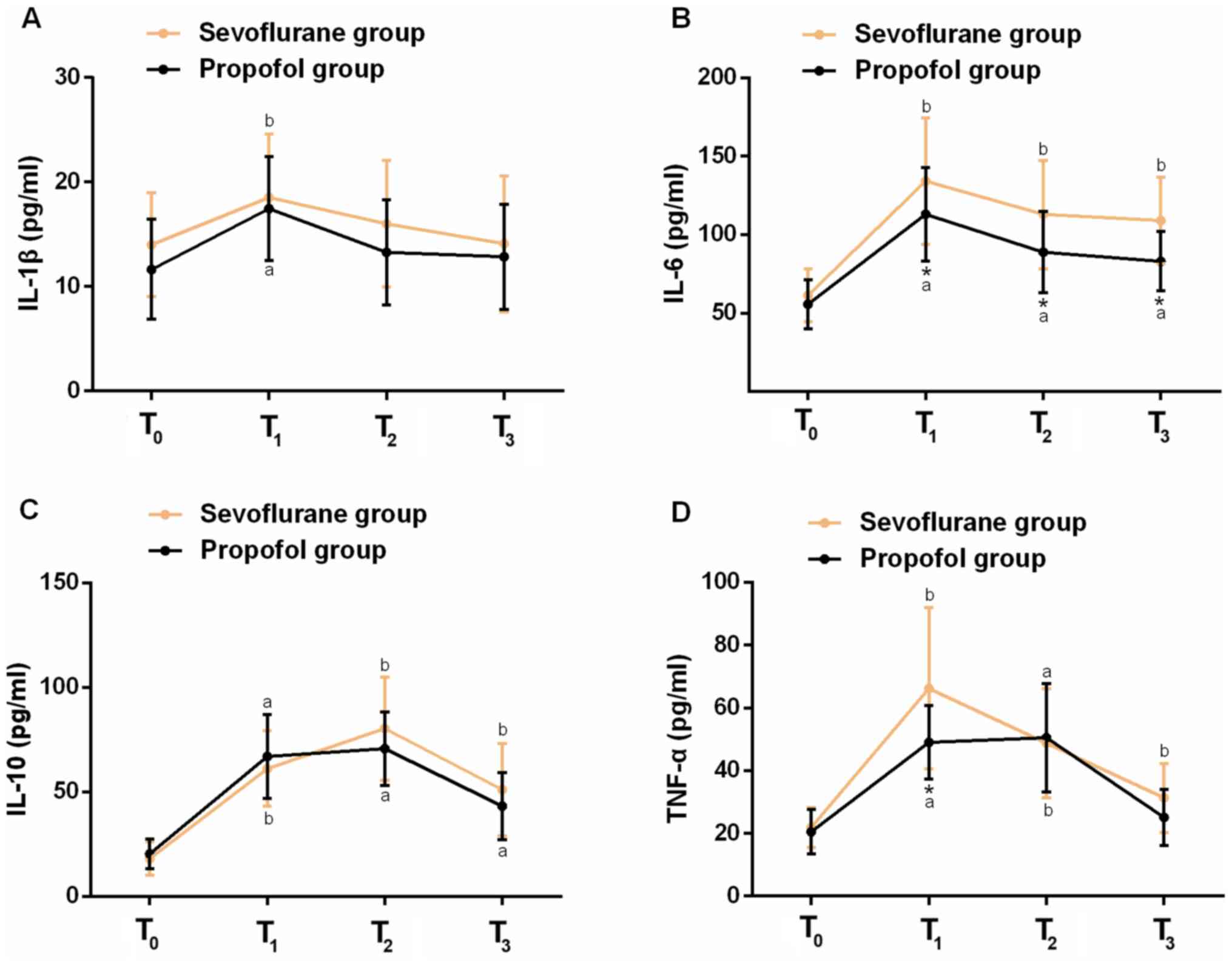 In order to investigate the effects of propofol and sevoflurane on inflammatory factors, the levels of serum inflammatory factors IL-1β, IL-6, IL-10 and TNF-α were measured in the propofol and sevoflurane group at T0, T1, T2 and T3 using ELISA. The results revealed that the levels of IL-1β, IL-6, IL-10 and TNF-α in the propofol and sevoflurane group were first increased, and then decreased to the level at T0. There was no significant difference between the levels of IL-1β, IL-6, IL-10 and TNF-α in the propofol group and those in the sevoflurane group at T0 (P>0.05). The levels of IL-1β, IL-6 and IL-10 in the propofol group were lower than those in the sevoflurane group at T3, and the level of IL-6 in the propofol group was significantly lower than that in the sevoflurane group at T1, T2 and T3 (P<0.05) (Fig. 3).