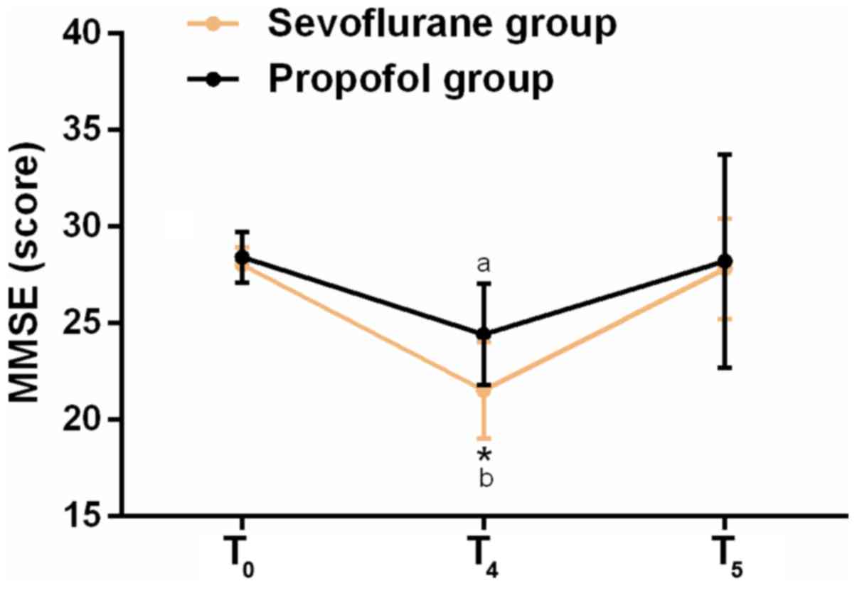 In order to investigate the effects of propofol and sevoflurane on the cognitive function, MMSE cognitive function scores in the propofol group and sevoflurane group were counted at T0, T4, and T5. The results showed that there was no significant difference between the MMSE cognitive function scores in the propofol and the sevoflurane group at T0 (P>0.05). MMSE cognitive function scores in the propofol group were significantly higher than those in the sevoflurane group at T4 (P<0.05), and MMSE cognitive function scores in the propofol group and the sevoflurane group at T4 were significantly lower than those at T0 (P<0.05). There was no significant difference between MMSE cognitive function scores in the propofol and the sevoflurane group at T5 and those at T0 (P>0.05) (Fig. 4).