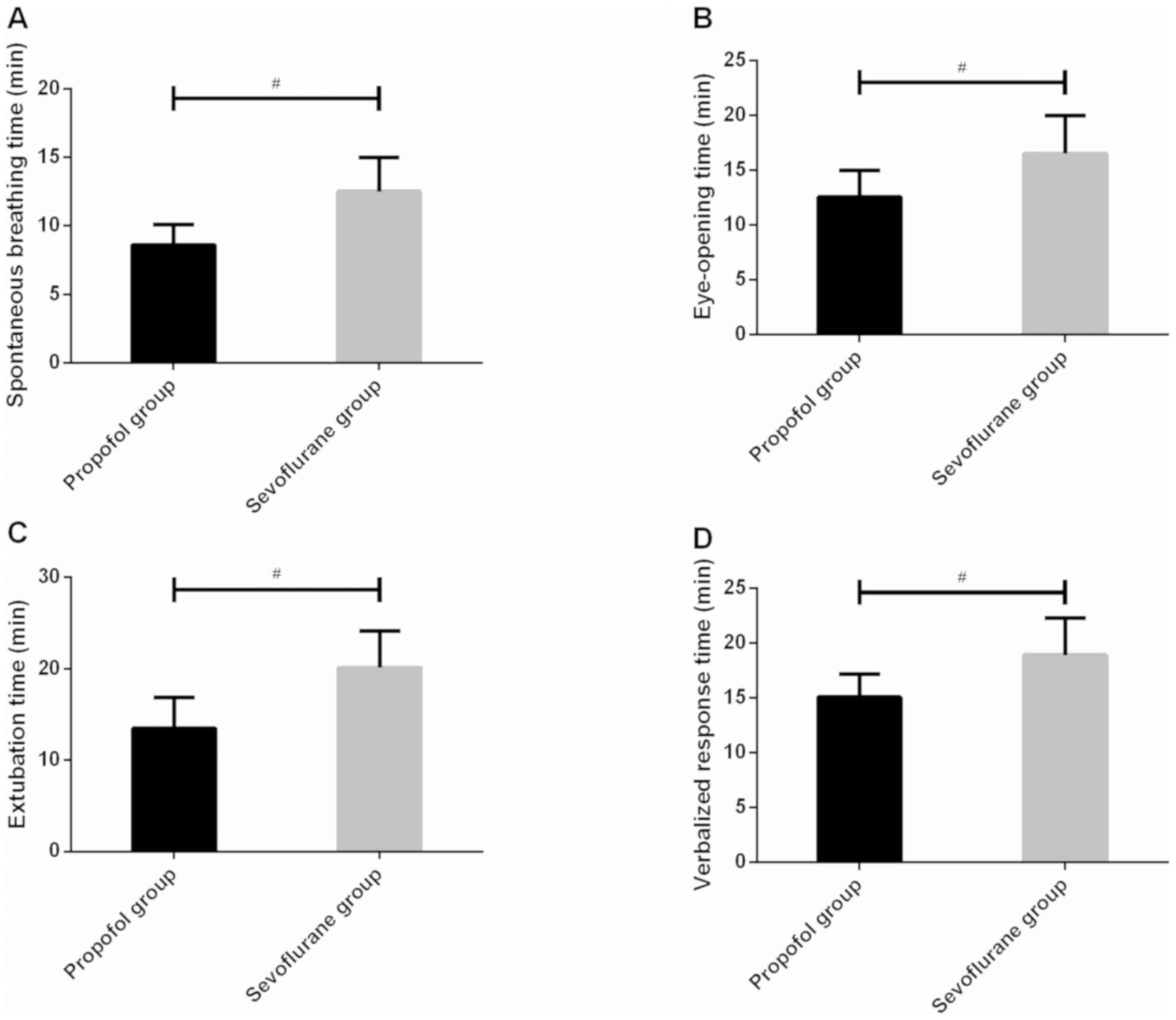 In order to compare the anesthetic effects of propofol and sevoflurane, the time of spontaneous breath, eye opening, extubation and verbal response were observed and recorded for both groups. The results showed that the time of spontaneous breath, eye opening, extubation and verbal response in the propofol group were significantly shorter than those in the sevoflurane group (P<0.05) (Fig. 5).