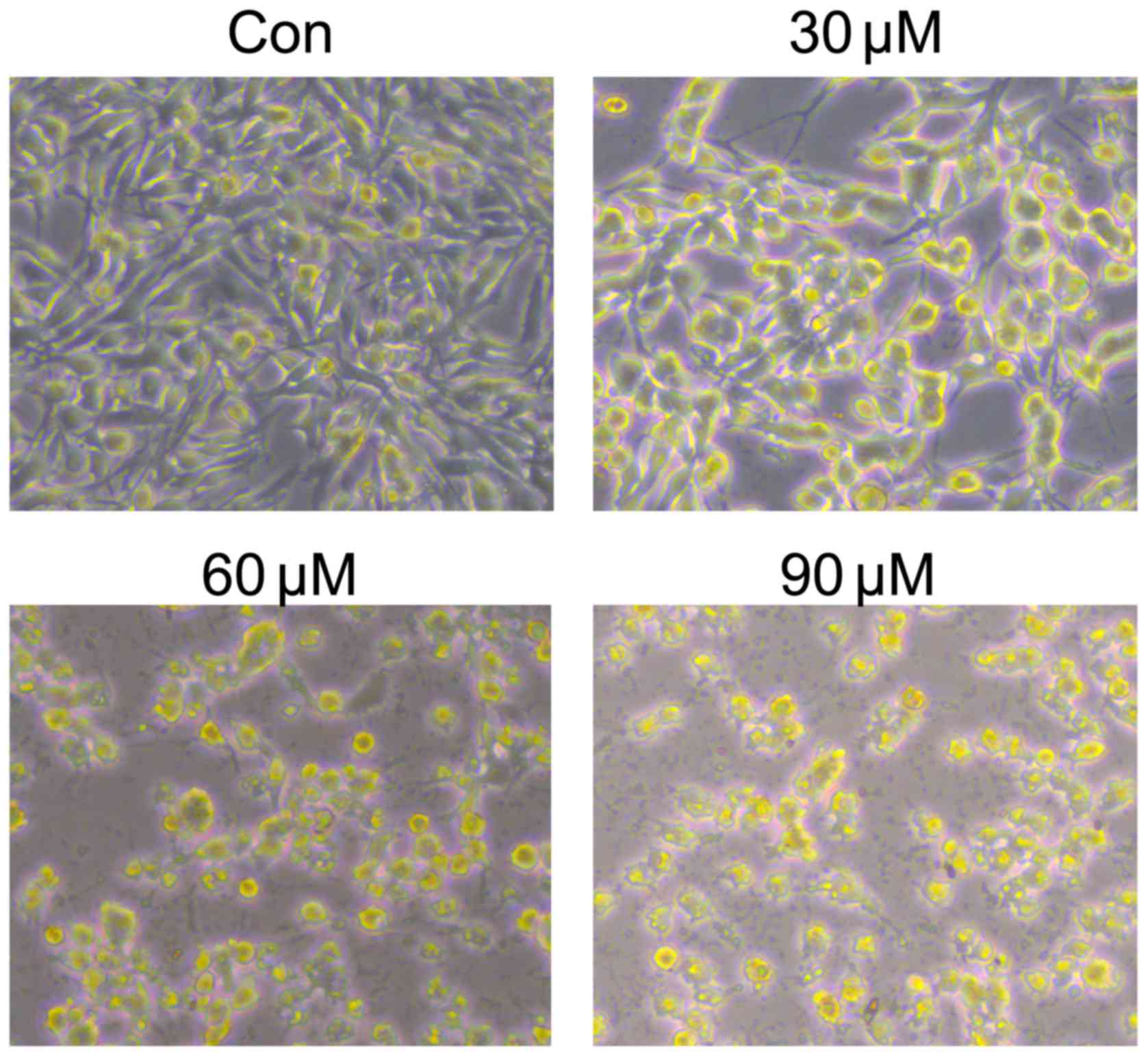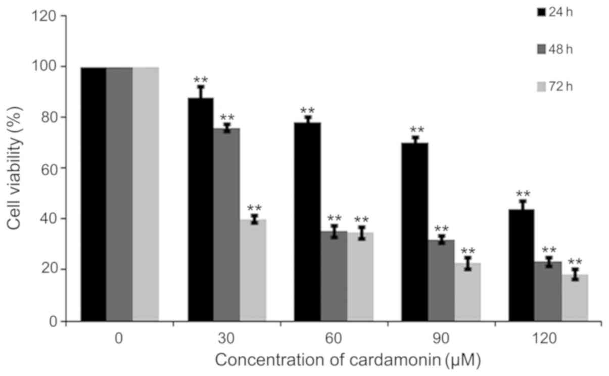 M14 cells were treated with varying cardamonin concentrations (0, 30, 60, 90 and 120 µM; n=4) for 24, 48 and 72 h. The MTS assay showed that cardamonin significantly decreased M14 cell viability (P<0.01; Fig. 1). Cell density was also decreased after cardamonin treatment for 24 h (Fig. 2). The results indicated that cardamonin could inhibit M14 cell growth.