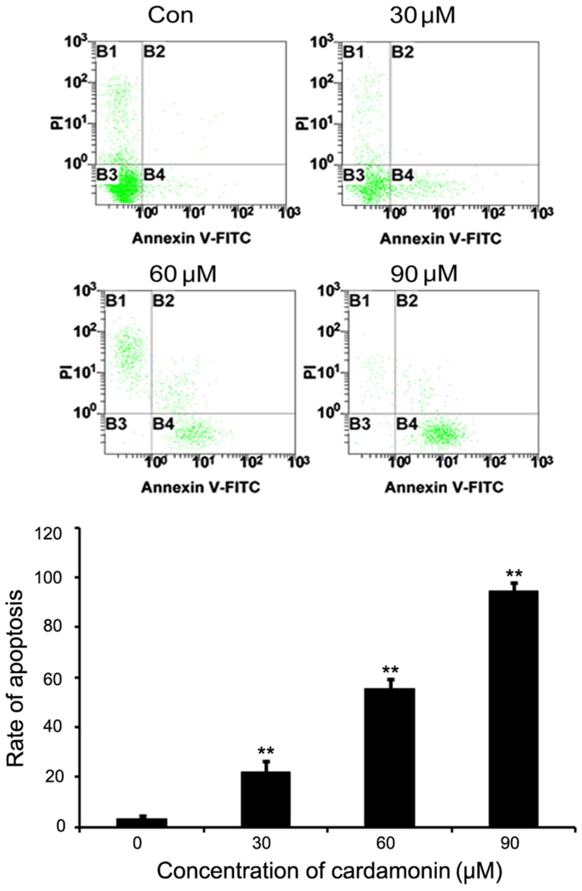 M14 cells were cultured in varying cardamonin concentrations (0, 30, 60 and 90 µM, n=3) for 24 h and then stained with Annexin V-FITC and PI for flow cytometry analysis. Results indicated that the untreated M14 cells were not stained by Annexin V and PI, whereas a significant dose-dependent increase was noted in the Annexin V and PI positive cells following cardamonin treatment (P<0.01; Fig. 3).
