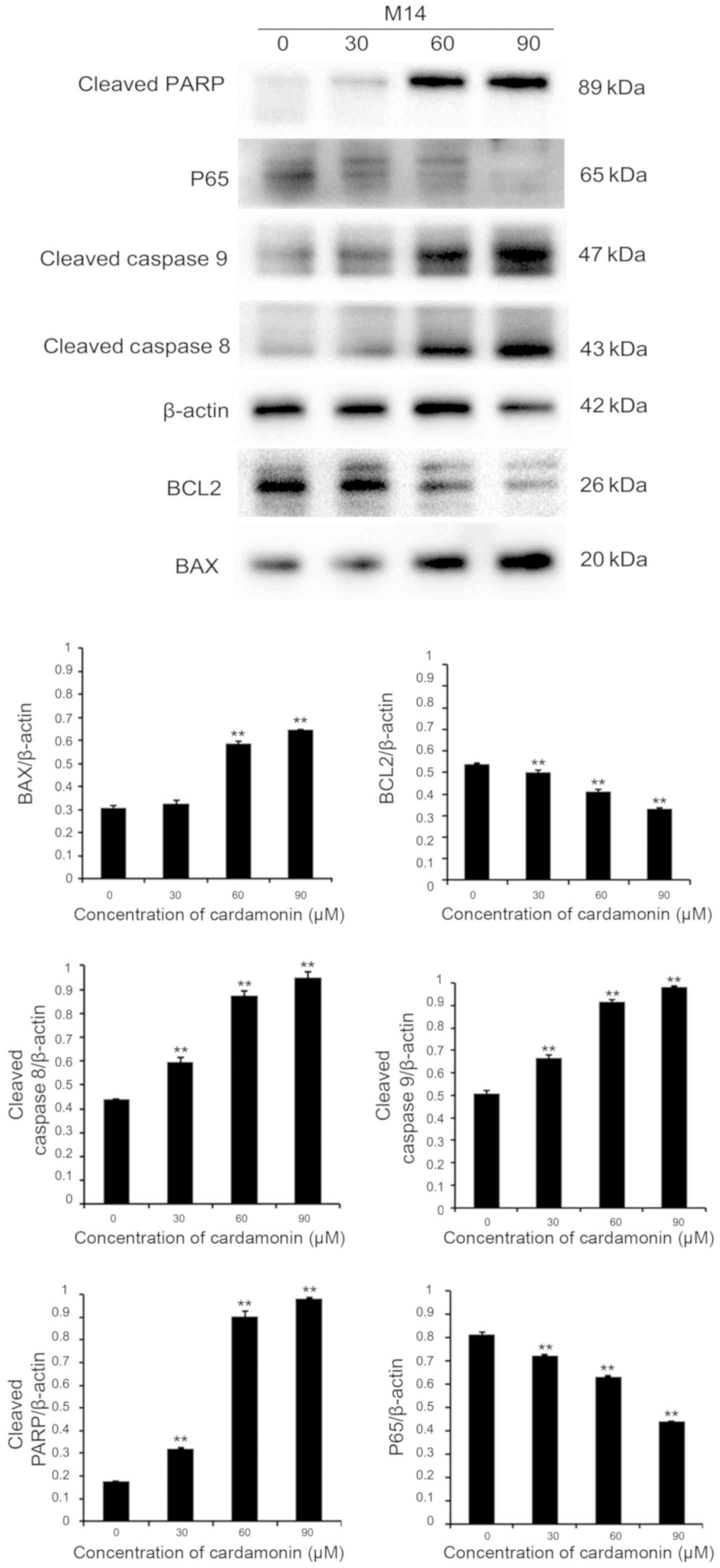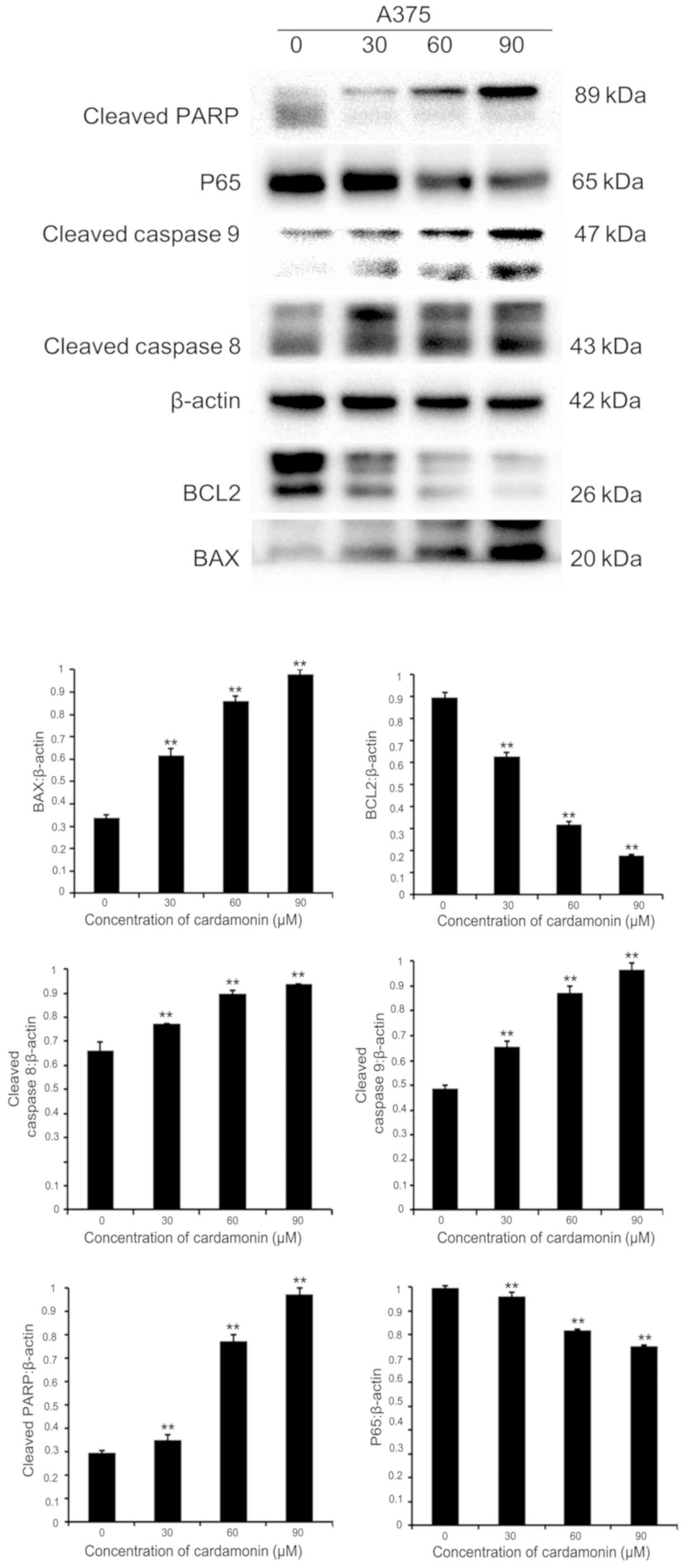 In order to investigate whether cardamonin induced melanoma cell apoptosis via the effects of apoptosis-associated proteins, immunoblotting was performed. Protein lysates were collected from two different cell lines (M14 and A375). They were cultured in varying cardamonin concentrations (0, 30, 60 and 90 µM; n=3) for 24 h. It was found that the pro-apoptotic protein BAX was upregulated, while the anti-apoptotic protein B-cell lymphoma-2 (BCL2) was downregulated in both cell lines. Intrinsic or extrinsic pathways may be involved in apoptosis, therefore the expression of cleaved caspase-8, −9 and cleaved PARP were investigated (12). These apoptotic signaling proteins increased significantly after 24-h treatment with varying cardamonin concentrations (P<0.01). P65 expression significantly decreased, thus indicating that cardamonin is a major anti-apoptotic regulator (P<0.01; Figs. 4 and 5). Results showed that cardamonin regulates the expression of important pro-apoptotic and anti-apoptotic proteins.