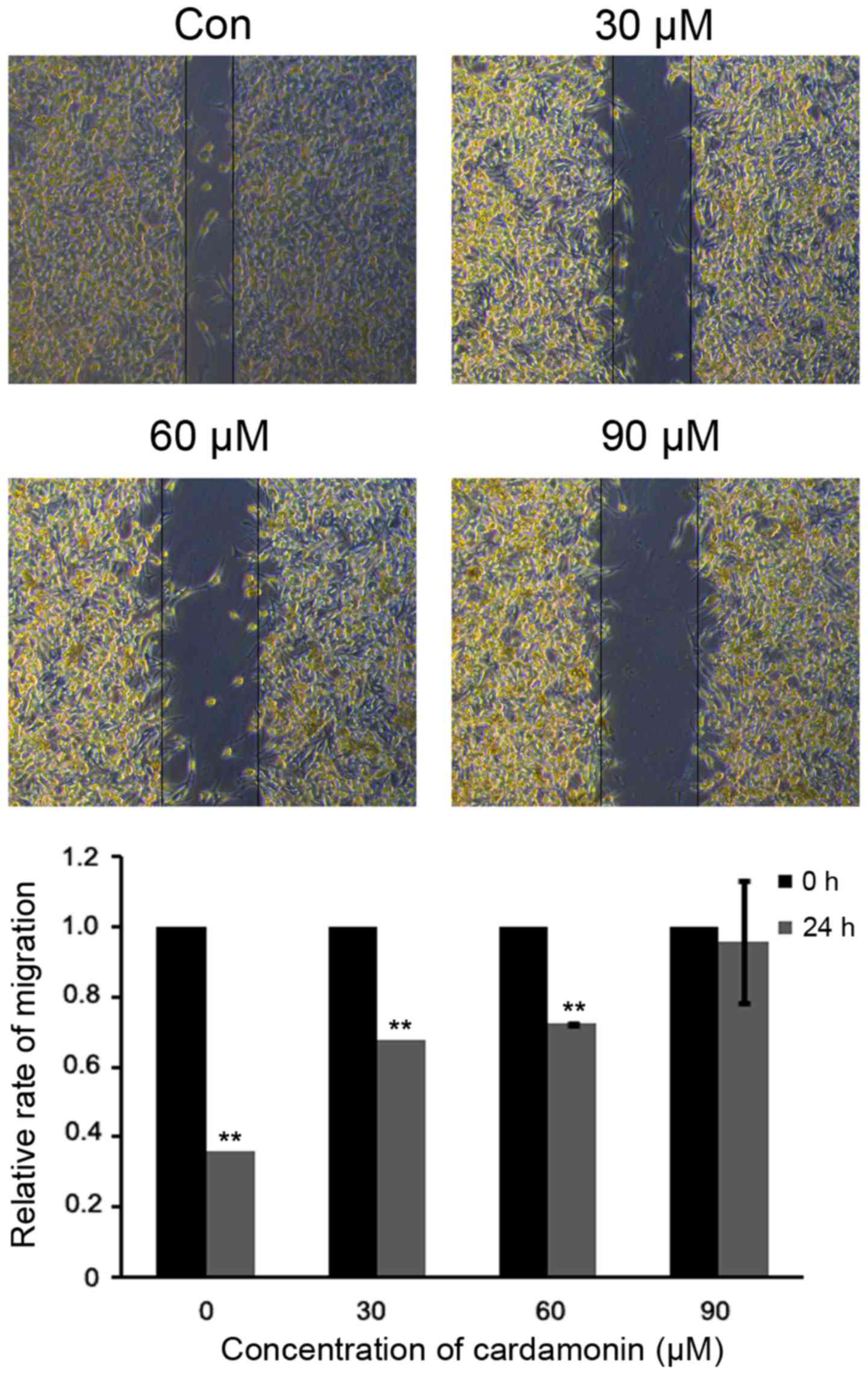 To assess whether cardmonin affects cell migration, a scratch-wounding assay was performed on M14 cells. Under varying cardamonin concentrations (0, 30, 60 and 90 µM; n=3), the open wound areas were significantly increased in comparison to the untreated cells (P<0.01). These data indicated that cardamonin suppressed M14 cell migration in a dose-dependent manner (Fig. 6).