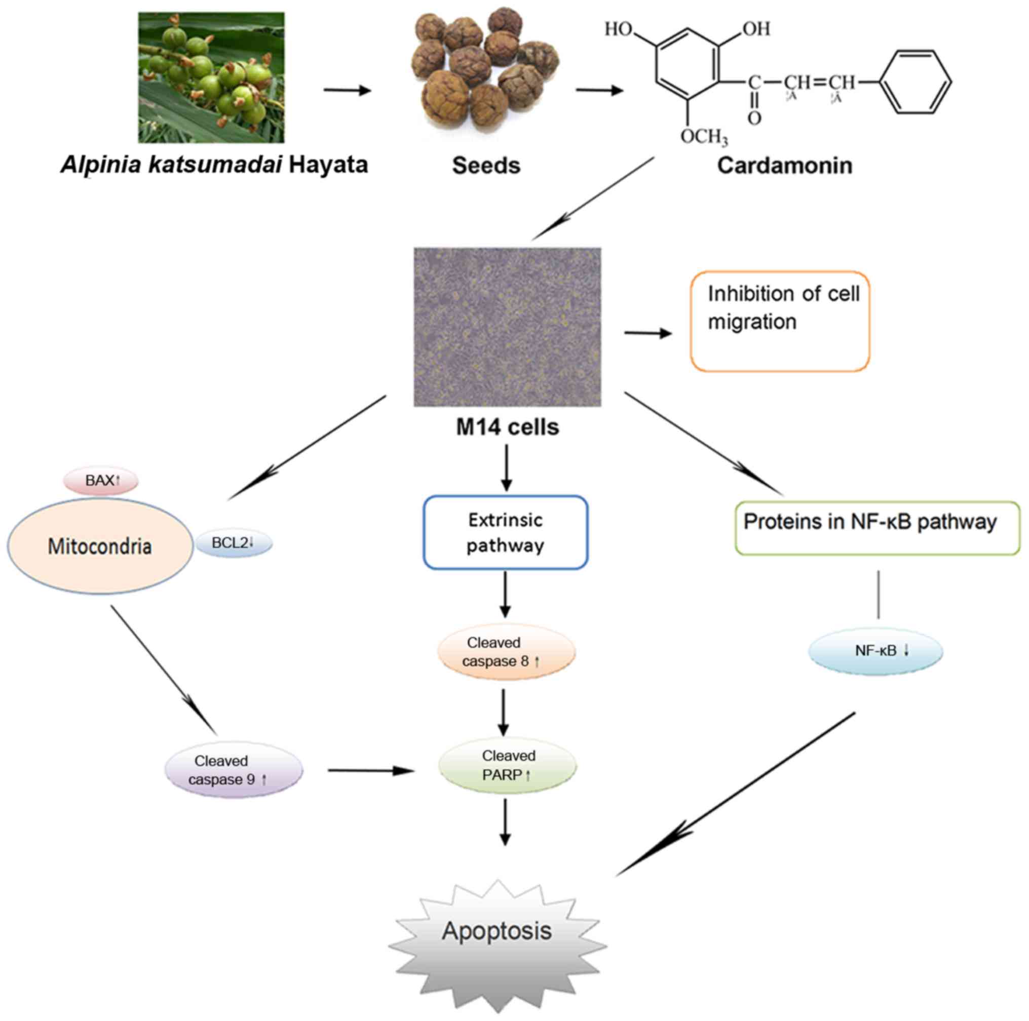 The present study demonstrated that cardamonin promotes apoptosis of melanoma cells via the regulation of proteins in the intrinsic, extrinsic and NF-κB pathways (Fig. 7). Cardamonin, as a natural compound, may be a potentially valuable factor for human melanoma treatment.