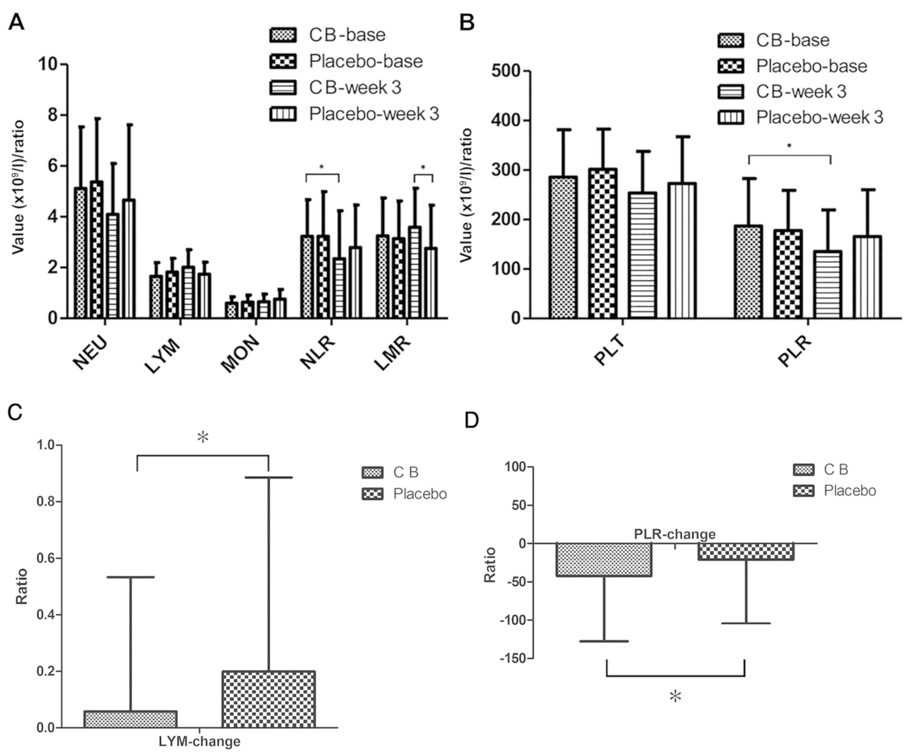 The effects of C. butyricum on the inflammatory response, immune function and nutritional status were evaluated by analyzing the differences between the two groups regarding blood cell count, systemic inflammatory response (SIR) biomarkers, lymphocyte subsets, immunoglobulin and albumin. The change in blood cell count and SIR biomarkers LMR, NLR and PLR was compared (Fig. 2). At baseline, the blood cell count and SIR biomarkers revealed no significant difference between the two groups. At week 3, the number of lymphocytes increased in the CB group and decreased in the placebo group, and the change between the two groups was significantly different (P<0.05). PLR decreased in the two groups, but a significant difference was only observed for the CB group. In addition, a significant difference was revealed between the two groups (P<0.05). NLR decreased in the two groups, but only demonstrated a significant decrease in the CB group (P<0.05). LMR increased in the CB group and decreased in the placebo group, though the difference was not significant. However, at week 3, LMR was significantly higher in the CB group compared with the placebo group (P<0.05). Subsequently, the peripheral blood lymphocyte subsets representing the cellular immune system were analyzed (Table IV). Cluster of differentiation (CD)16+CD56+ designation represented the natural killer (NK) cells, and CD19+designation represented the B lymphocyte population. The results revealed that the levels of CD3+CD8+ and CD16+CD56+ in the CB group were higher compared with the placebo group, though the difference was not significant. CD3+CD4+ percentage and ratio in the CB group displayed a decreasing trend. However, no significant difference was observed in the changes of these indicators between the two groups. Humoral immune function was also investigated by evaluating IgG, IgA, IgM and IgE levels (Table V). The results revealed that all of these immunoglobulins decreased in the two groups, although without any significant difference. Alterations in albumin expression levels were also evaluated (Table II). Albumin expression increased in the CB group and decreased in the placebo group, although the difference was not significant. Overall, through blood indicator analysis, it was established that the SIR index in the CB group was significantly improved compared with the placebo group, suggesting that C. butyricum reduces the systemic inflammatory response. However, lymphocyte subsets, immunoglobulin and albumin expression levels did not significantly alter.
