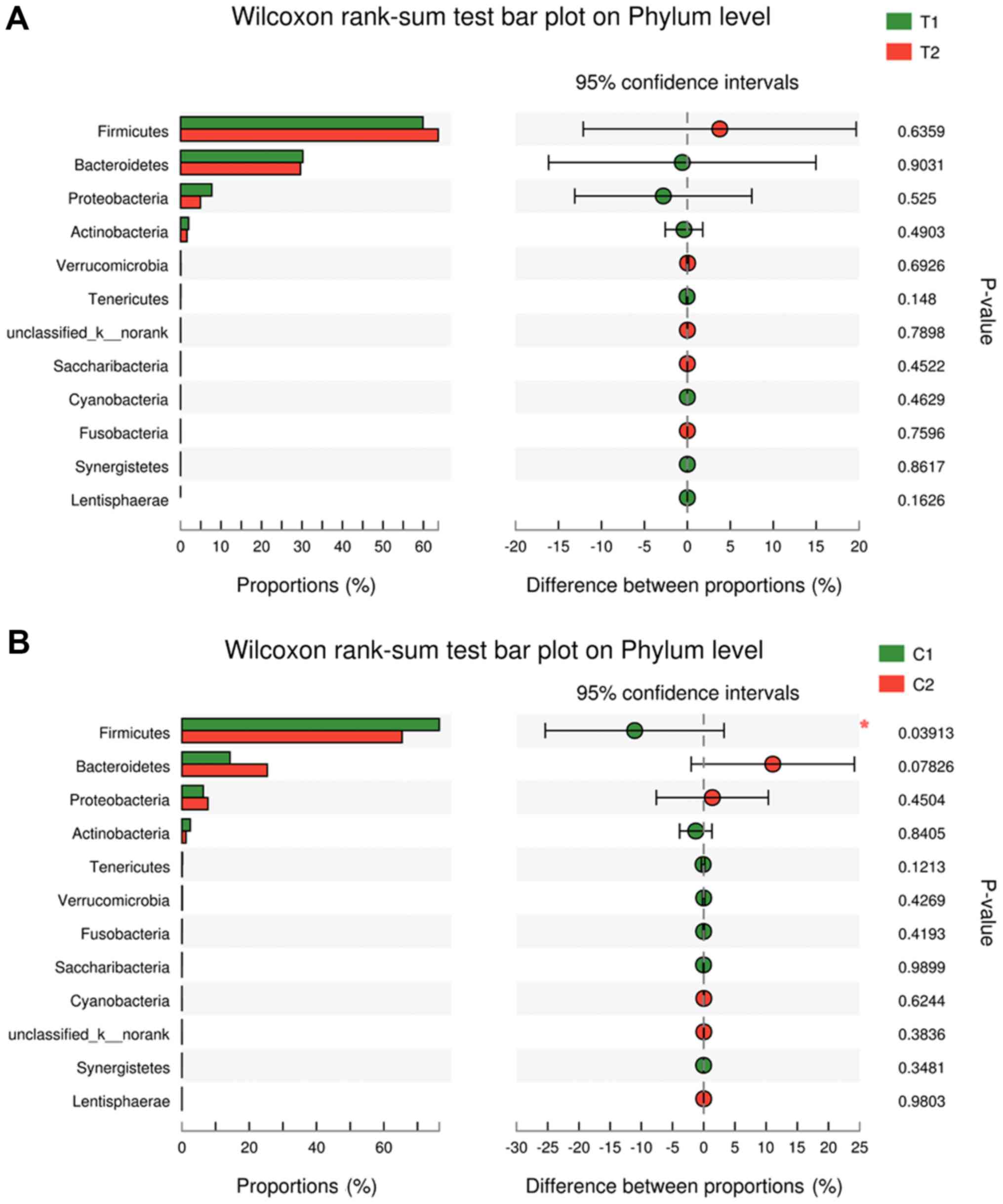 The Wilcoxon test was used to compare the difference of each index and the difference of changes of each index of two groups using R 3.4.3 (https://www.r-project.org/). The Kruskal-Wallis test with Dunn multiple comparisons test was used to analyze the difference of OTUs between two groups. Community diversity analysis and significant differences were analyzed using the Illumina Miseq PE300 platform. Results are expressed as mean ± standard deviation of at least ten independent experiments. P<0.05 was considered to indicate a statistically significant difference.