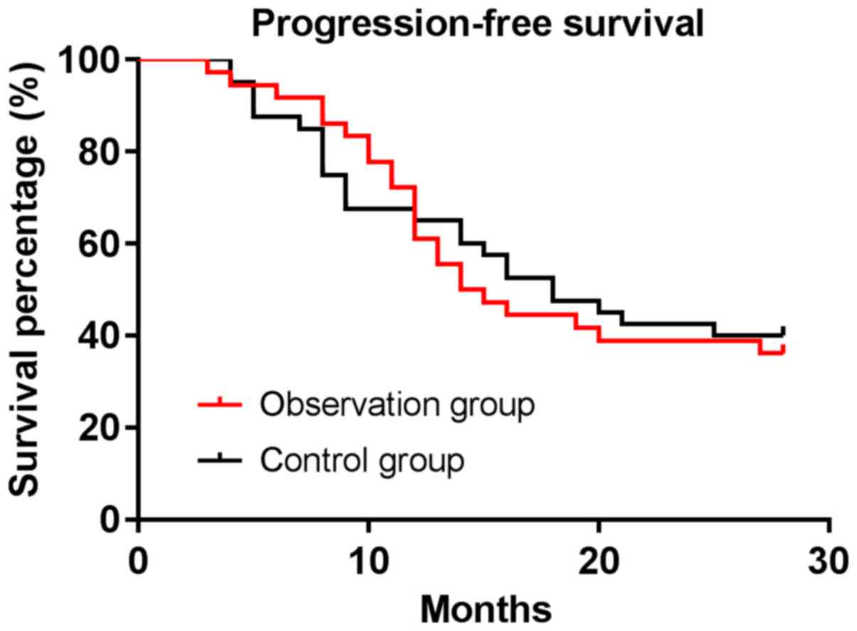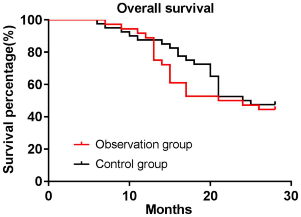 All patients were followed up with a median follow-up time of 16.5–28 months. The median progression-free survival time of patients was 14.5 months in the observation group and 18 months in the control group. The progression-free survival rate of patients was 36.11% in the observation group and 40.00% in the control group, with no difference between the two groups (P>0.05). The median survival time of patients was 22.5 months in the observation group and 24.5 months in the control group. The OS rate of patients was 44.44% in the observation group and 47.50% in the control group, with no difference between the two groups (P>0.05) (Figs. 1 and 2).