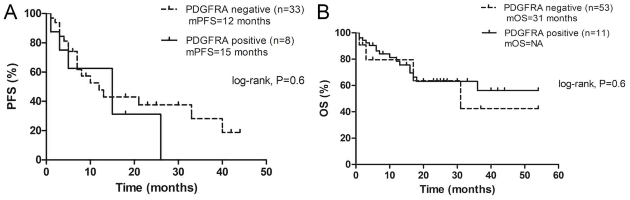 The phosphorylated forms of c-Kit and PDGFRA were selected as biomarkers because phosphorylated proteins are the biologically active states that function within the cell. In order to gain comprehensive understanding of the phosphorylated functional proteins in the c-Kit/PDGFRA signaling pathway and their association with clinicopathological characteristics of patients with ALK fusion, the expression of p-c-Kit and p-PDGFRA were investigated, along with their association with the clinical outcomes of patients with advanced stage NSCLC with ALK fusion.