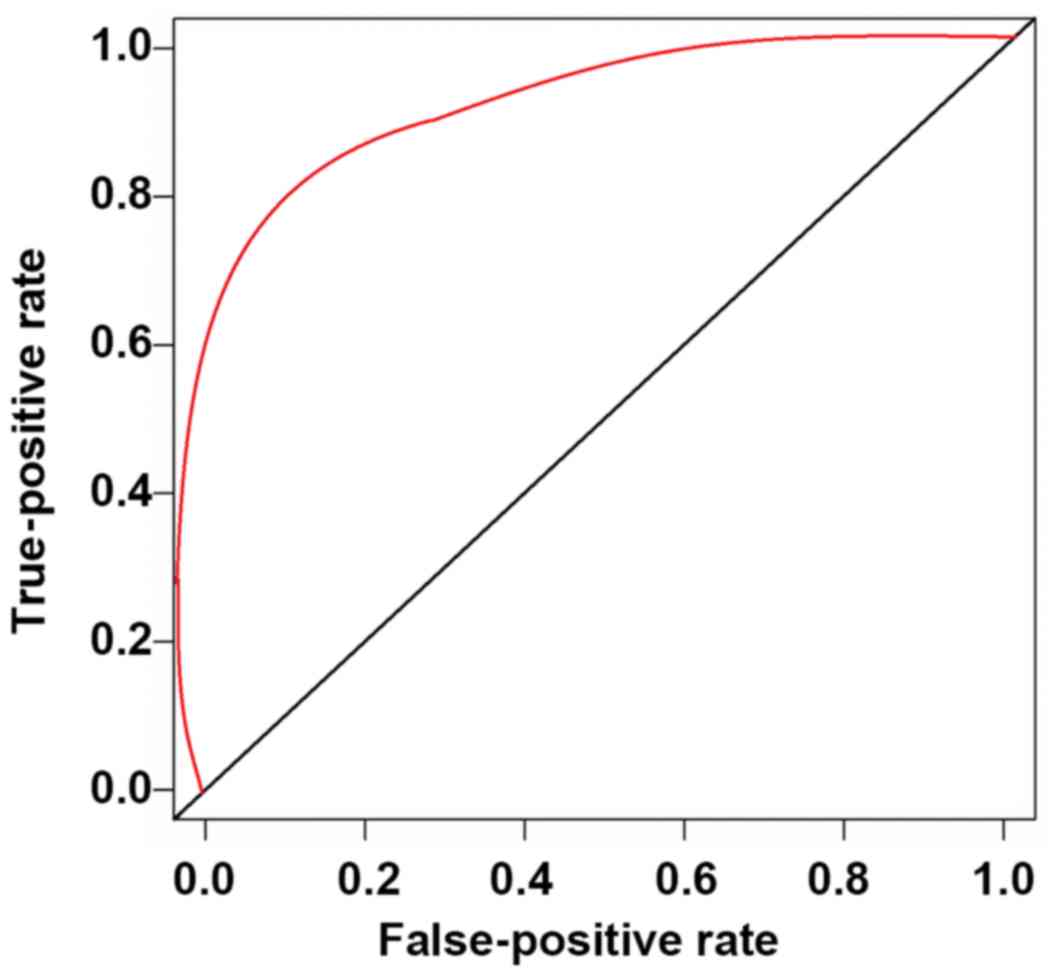 SPSS v.22.0 statistical software (IBM Corp., Armonk, NY, USA) was used to analyze and process the data. Count data were expressed as rates and their comparison between two groups was performed using Chi-square test. Measurement data were expressed as mean ± standard deviation and t-test was used for their comparison between groups. One way analysis of variance was used for multiple comparisons and LSD test was the post hoc test used. The diagnostic value was analyzed by ROC curve analysis. Spearman's correlation analysis was performed using linear correlation analysis. P<0.05 was considered to indicate a statistically significant difference.