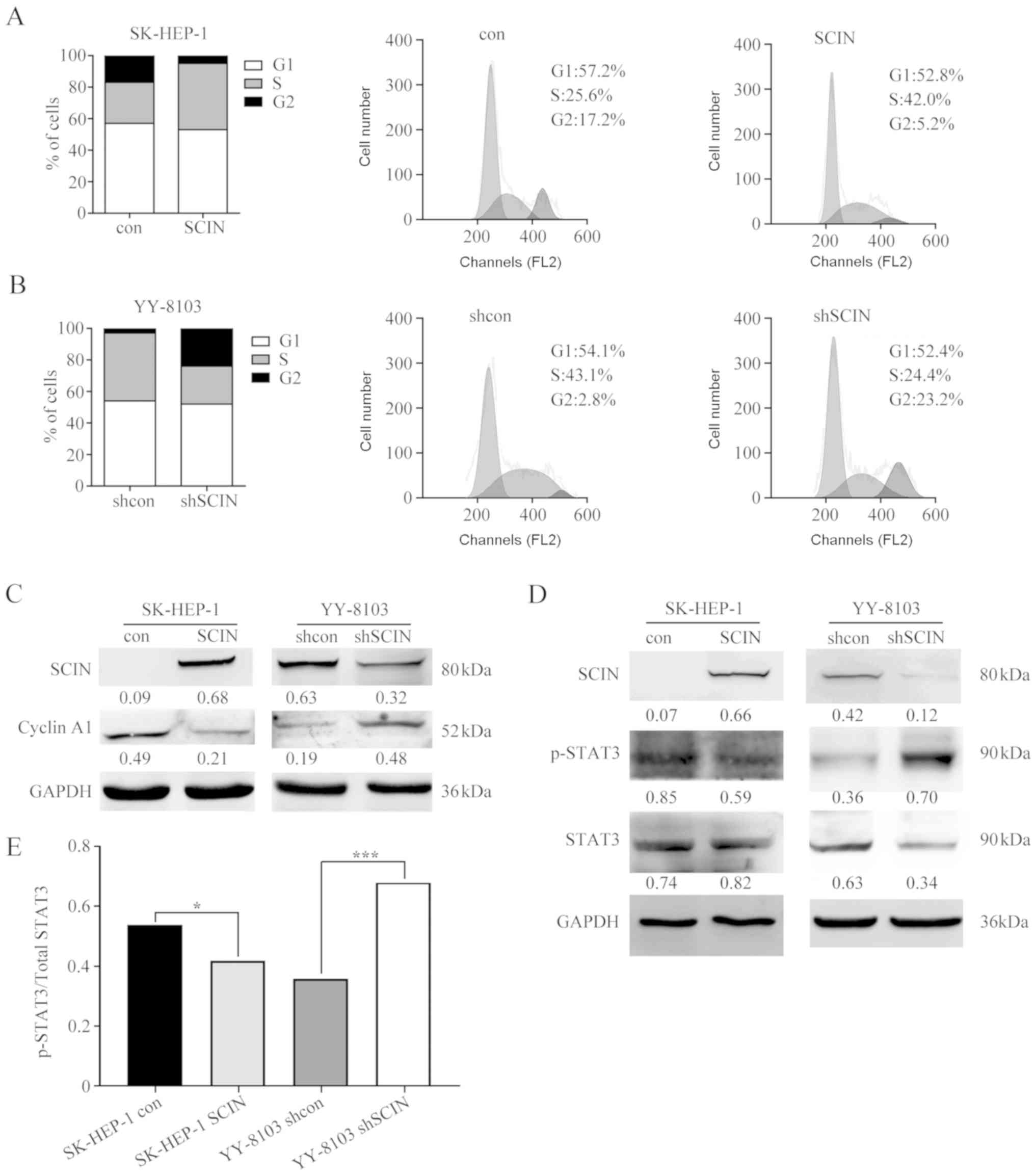 Overall, the present study demonstrated that SCIN expression was downregulated in HCC and that SCIN functioned to suppress the proliferation of HCC cells, which may be mediated by cyclin A1 and STAT3, suggesting that SCIN may be a tumor suppressor gene in HCC. Furthermore, SCIN may serve as a valuable prognostic marker, as well as a potential therapeutic target for HCC.