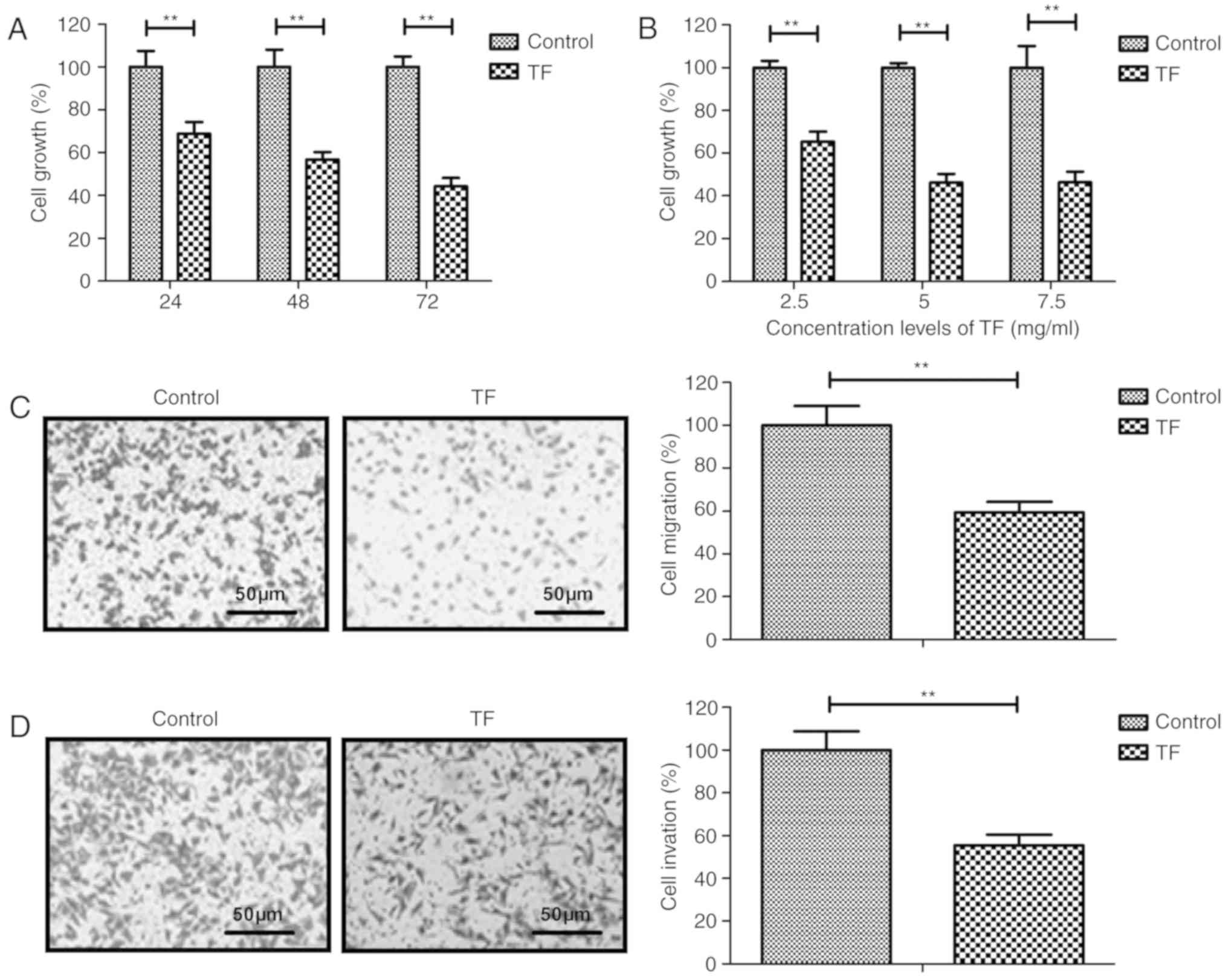 The inhibitory effects of TF on the proliferation, migration and invasion of A549 cells were analyzed in vitro. Compared with the control group, TF-treated cells exhibited a significant dose-dependent decrease in proliferation (P<0.01; Fig. 1A and B). A concentration of 5 g/ml TF inhibited the proliferation of A549 cells to the greatest extent. Furthermore, treatment with 5 mg/ml TF for 24 h significantly inhibited the migration and invasion of A549 cells compared with the control group (P<0.01; Fig. 1C and D). These results indicated that TF treatment significantly inhibited the proliferation, migration and invasion of A549 cells.